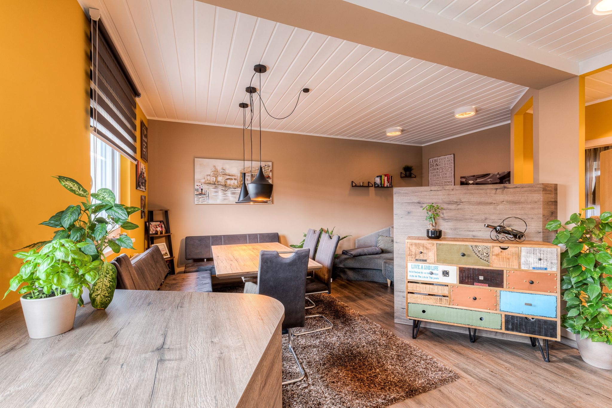 Ein Küchen- und Essbereich, wie er funktioneller nicht sein könnte: ein großer, ausziehbarer Esstisch, an dem die ganze Familie Platz findet, viel Stauraum mit praktischen Auszügen – zum Verstecken seiner unzähligen Küchengeräte, eine große Arbeitsfläche und gemütliches indirektes Licht über die abgehängte Decke sowie ausreichend direktes Licht im Arbeitsbereich.