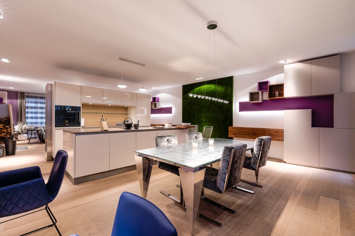 Das Farbkonzept ist an die Lieblingsfarbe der Kunden angelehnt und zeigt sich in Form von Wandfarben, kleinen Möbelstücken als Akzente sowie Wandpaneelen und diversen Dekoelementen. Verschiedene Nuancen einer Farbe sorgen für Kontraste und somit für mehr Lebendigkeit im Raum. Gleichzeitig verleiht die Materialkomposition aus glatten, farblich lackierten Oberflächen, geprägtem Eichenholz, goldener Spachteltechnik mit Struktur und Stoffen aus Samt der Wohnung ein gewisses Etwas. Die selben Farben und Materialien ziehen sich durch die gesamte Wohnung hindurch und kommen in verschiedenster Ausführung immer wieder vor. Dies verleiht der Wohnung ein einheitliches und stimmiges Gesamtbild.