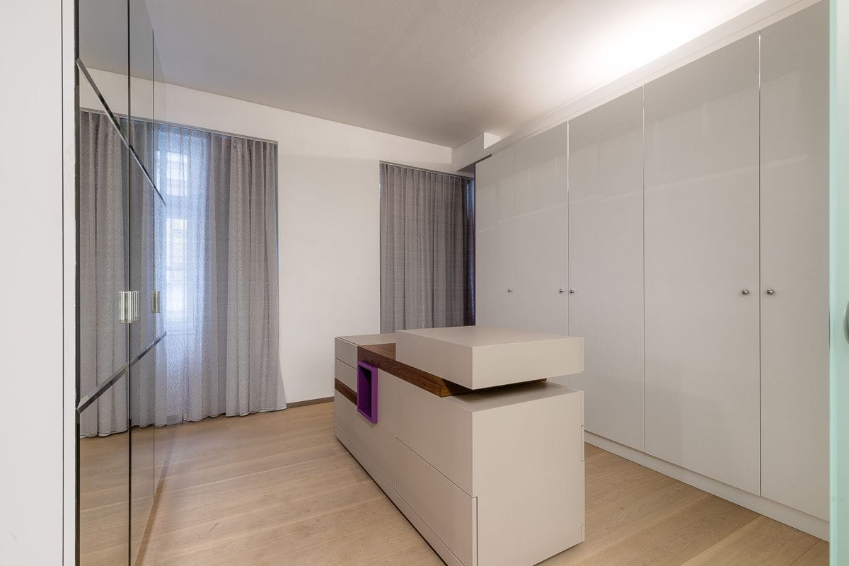 Speziell für den Schrankraum haben wir eine Kommode entworfen, die nicht nur in Funktion durch verschiedenste Stauraum- und Ablagemöglichkeiten – natürlich auf den Bedarf unserer Kunden abgestimmt – überzeugt, sondern welche auch durch ihre Form, Farb- und Materialgestaltung zu den bestehenden Schränken passt und dem Raum etwas Besonderes verleiht.