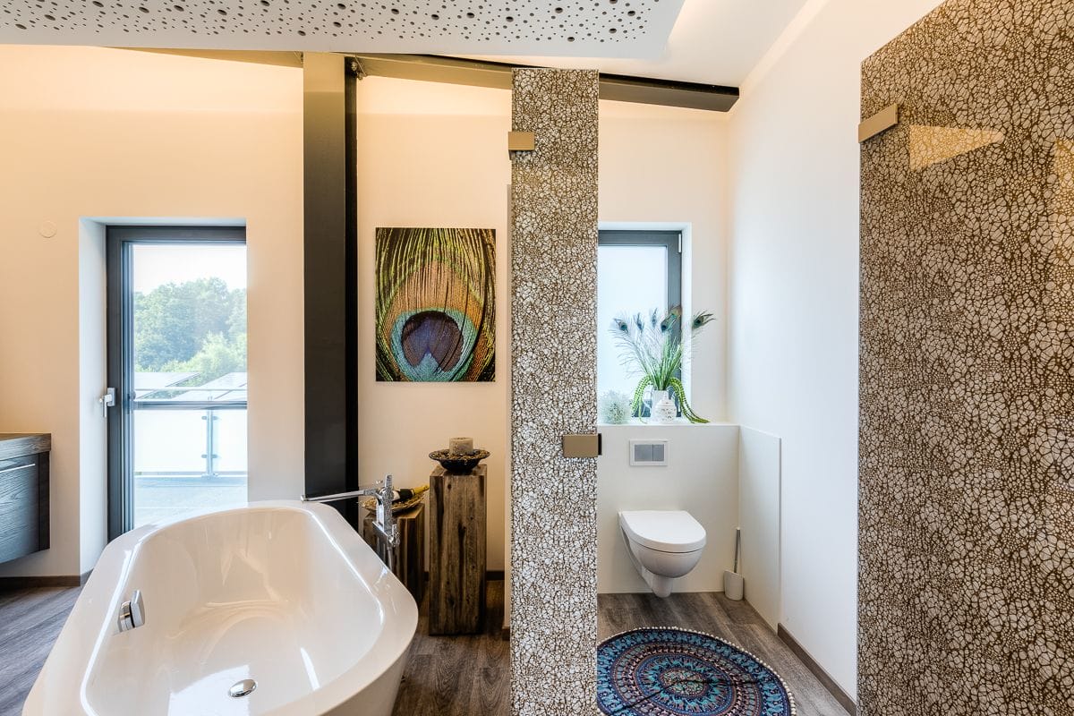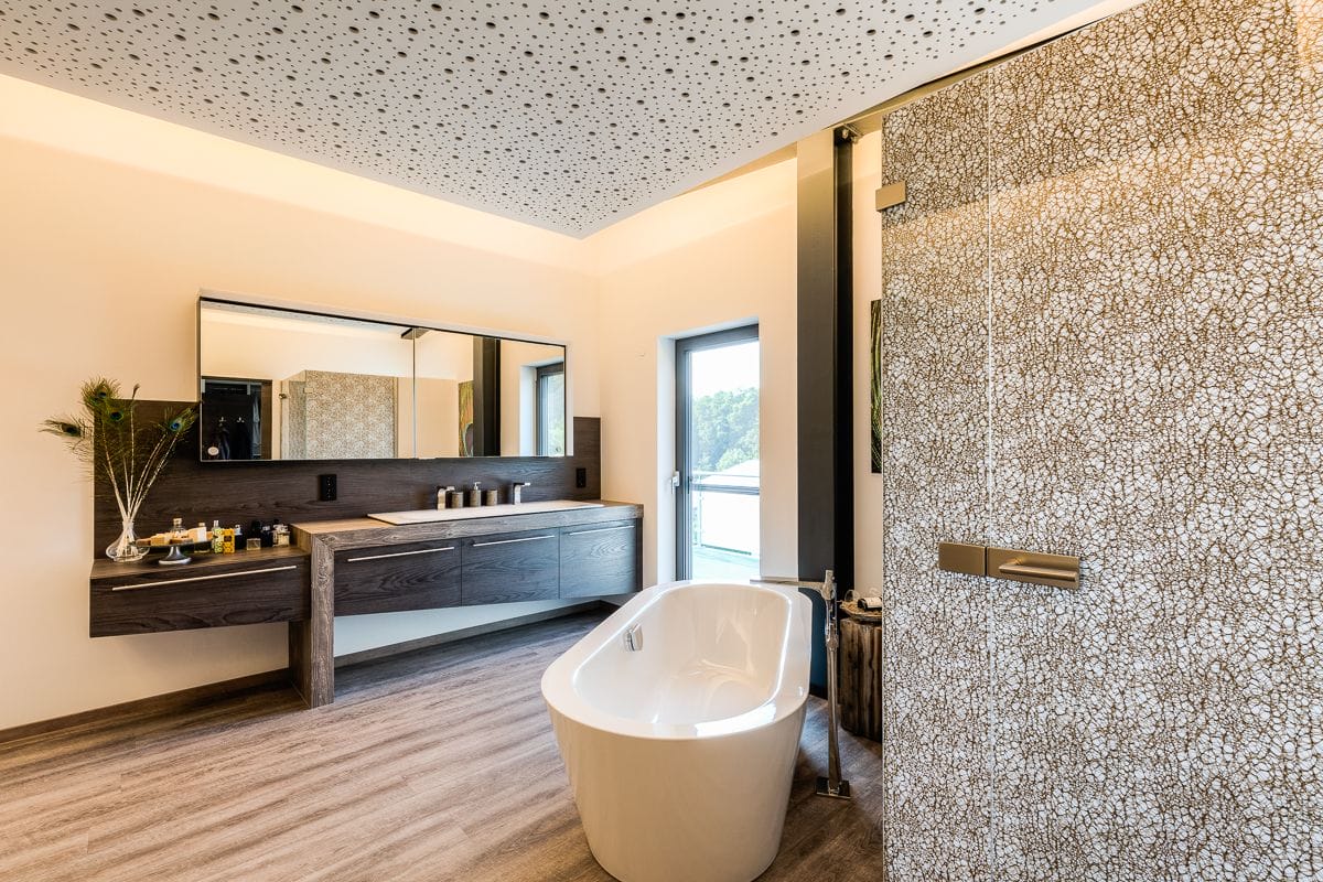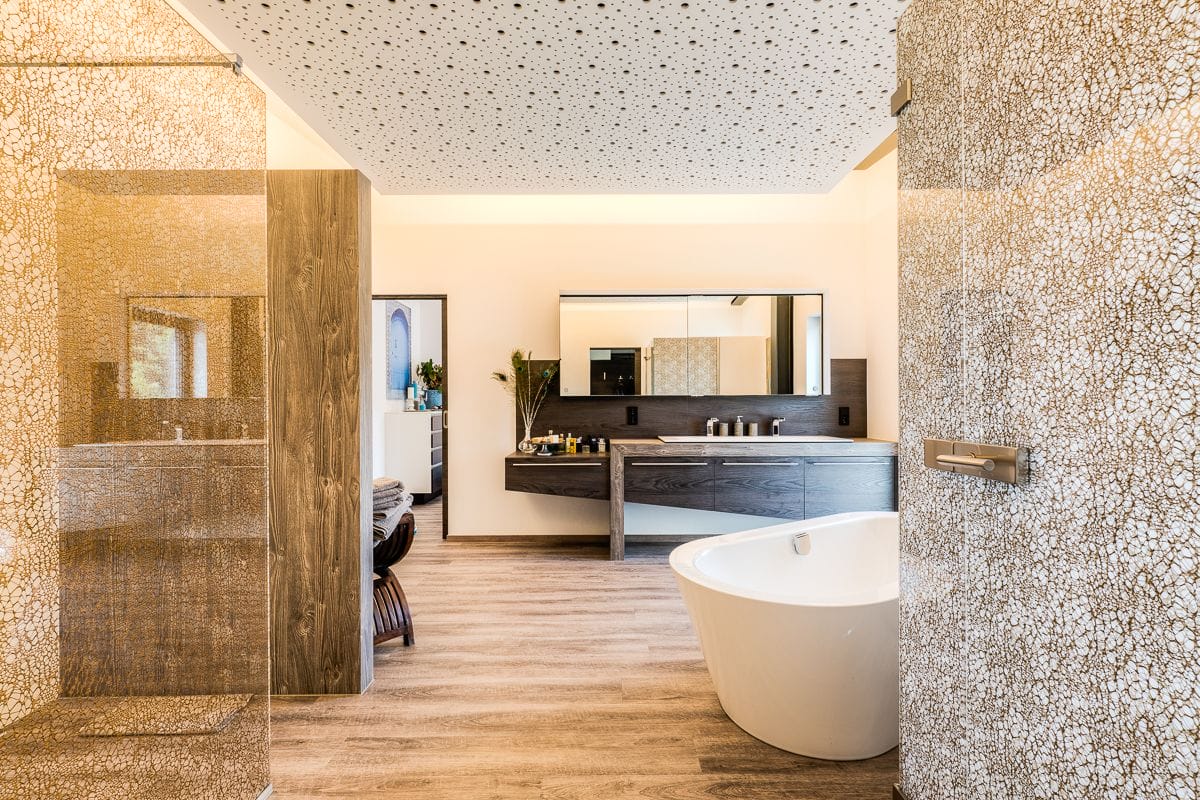 Die Anforderungen an das Badezimmer waren ein zweites abgeschlossenes WC, eine Dusche, eine freistehende Badewanne und zwei Waschbecken. Anstatt mit Fliesen zu arbeiten haben wir uns für verschiedene Gläser und wasserfeste Kunststoffmaterialien entschieden, die durch ihr eigenes Design und Form eine spannende Optik ergeben.