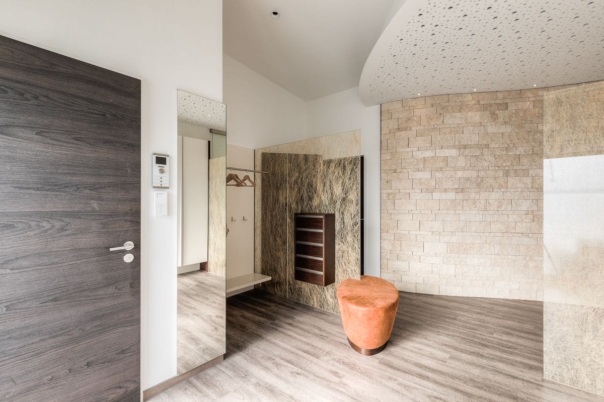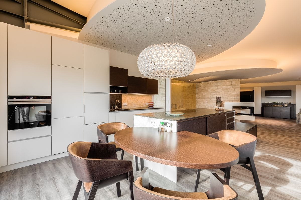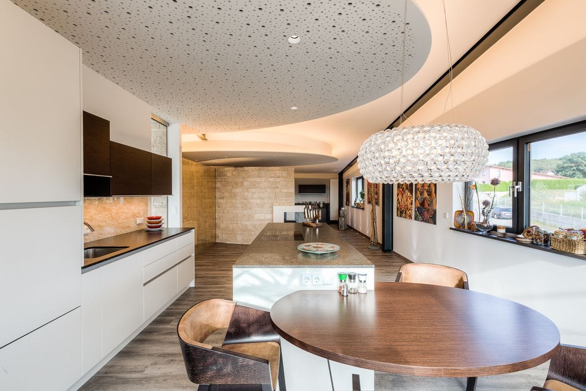 Durch die Offenheit der Wohnung spielte auch die Akustik eine wichtige Rolle. Dieses Thema wurde mittels zweier ellipsenförmiger Deckenkonstruktionen gelöst, die sich durch die gesamte Wohnung ziehen und mit Akustikpaneelen versehen sind. Zudem wurden zu den zwei ellipsenförmigen Deckenabsenkungen – die übrigens gleichzeitig auch eine indirekte Beleuchtungsfunktion mit sich bringen – Akustikplatten mit speziellem Lochmuster gewählt, die gut zur Gesamtoptik passen.