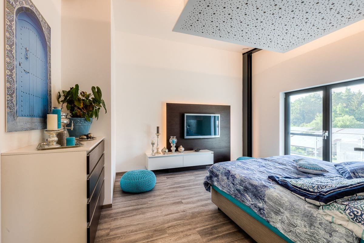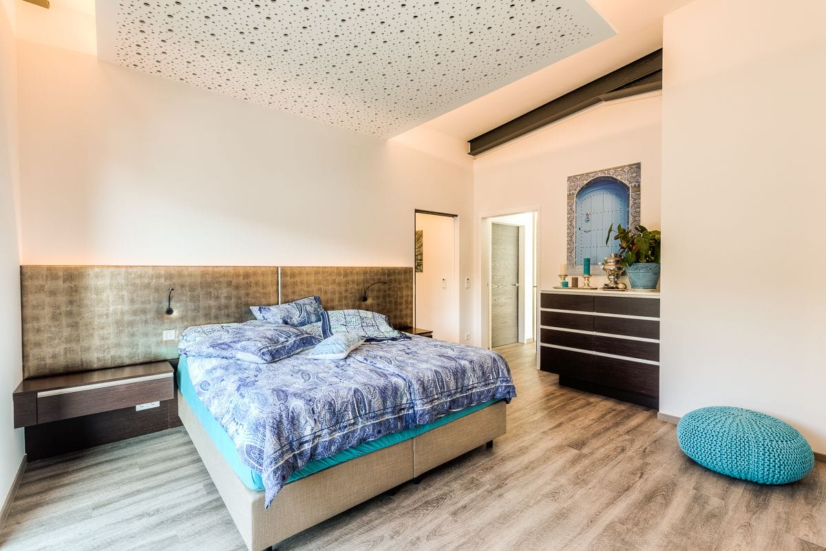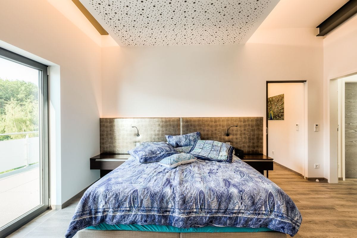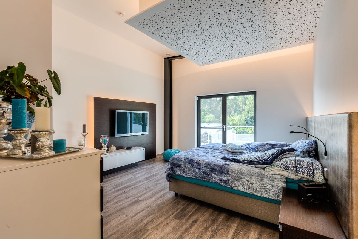 Durch die Offenheit der Wohnung spielte auch die Akustik eine wichtige Rolle. Dieses Thema wurde mittels zweier ellipsenförmiger Deckenkonstruktionen gelöst, die sich durch die gesamte Wohnung ziehen und mit Akustikpaneelen versehen sind. Zudem wurden zu den zwei ellipsenförmigen Deckenabsenkungen – die übrigens gleichzeitig auch eine indirekte Beleuchtungsfunktion mit sich bringen – Akustikplatten mit speziellem Lochmuster gewählt, die gut zur Gesamtoptik passen.
