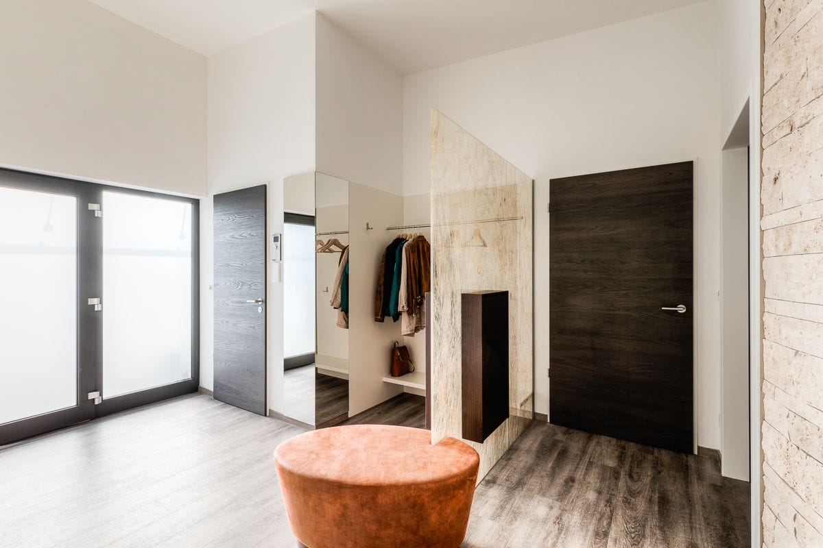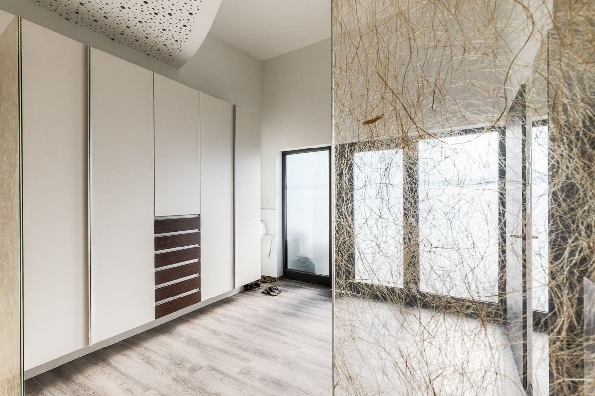 Wir haben also damit begonnen, nach passenden Materialien zu suchen, die schlicht genug bleiben, um die Elemente der Stahlkonstruktion wirken zu lassen, und trotzdem selbst eine besondere Wirkung mit sich bringen. Zu den Stahlelementen war dringend viel Wärme notwendig. Deshalb entschieden wir uns für einen hellen Vinylboden mit Holzcharakter, der sich durch die ganze Wohnung einheitlich durchzieht. Dazu ein heller Naturstein für zwei halbhohe, geschwungene Wände zwischen Eingangsbereich, Küche, Arbeitsbereich und Wohnbereich, welche nur mit speziellen, halbhohen Glaselementen mit Grasstruktur geschlossen wurden. Dies gewährt eine Durchsicht in den Arbeitsbereich und gleichzeitig hat man den Rückhalt, dass man nicht direkt in den Liegebereich des Wohnzimmers sieht. Die halbhohen Stein- und Glaswände sorgen dennoch dafür, dass der Loftcharakter gut erhalten bleibt. Eine sehr offene Konstruktion, die trotzdem kleine geschützte Bereiche in sich hält.
