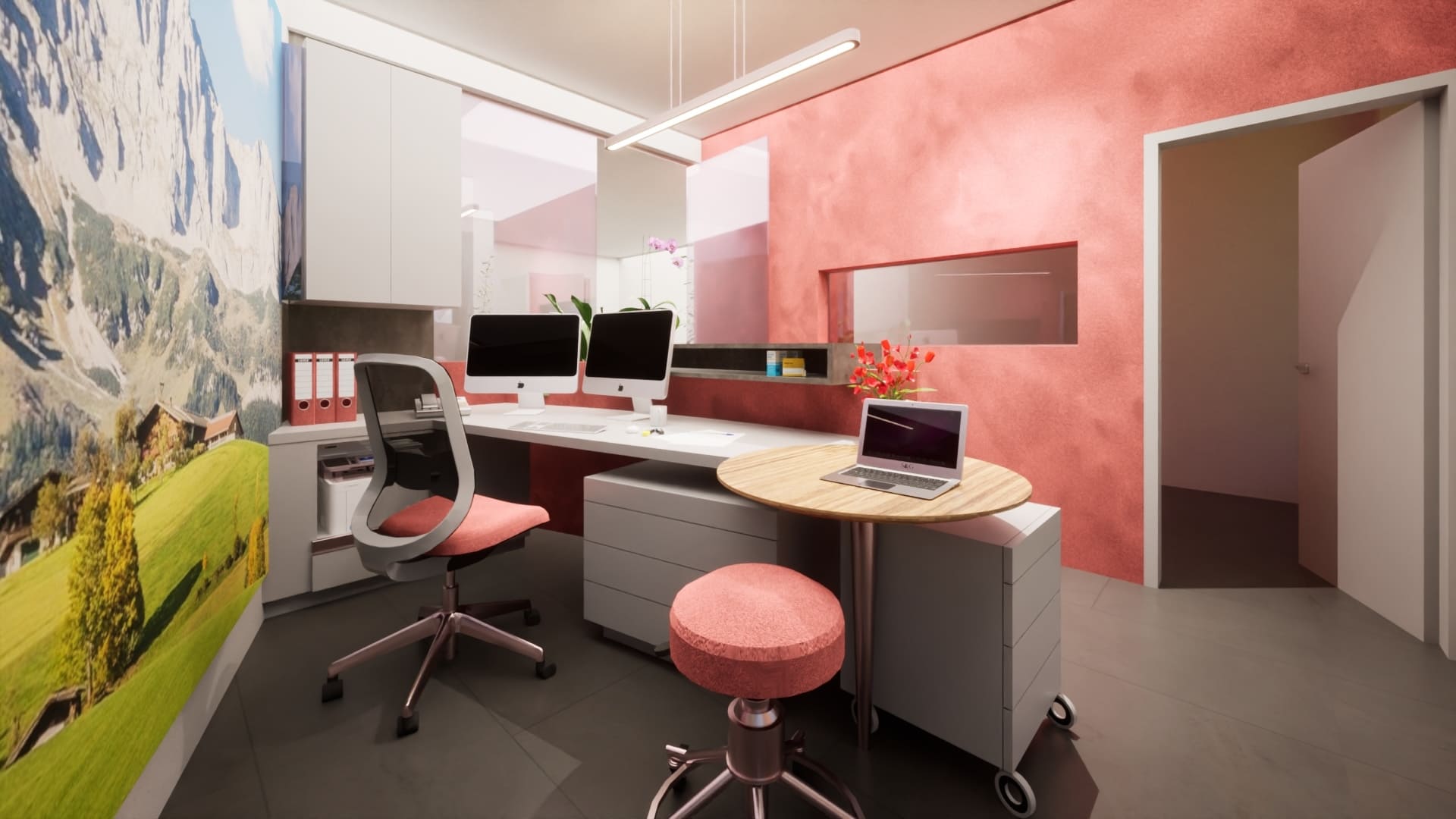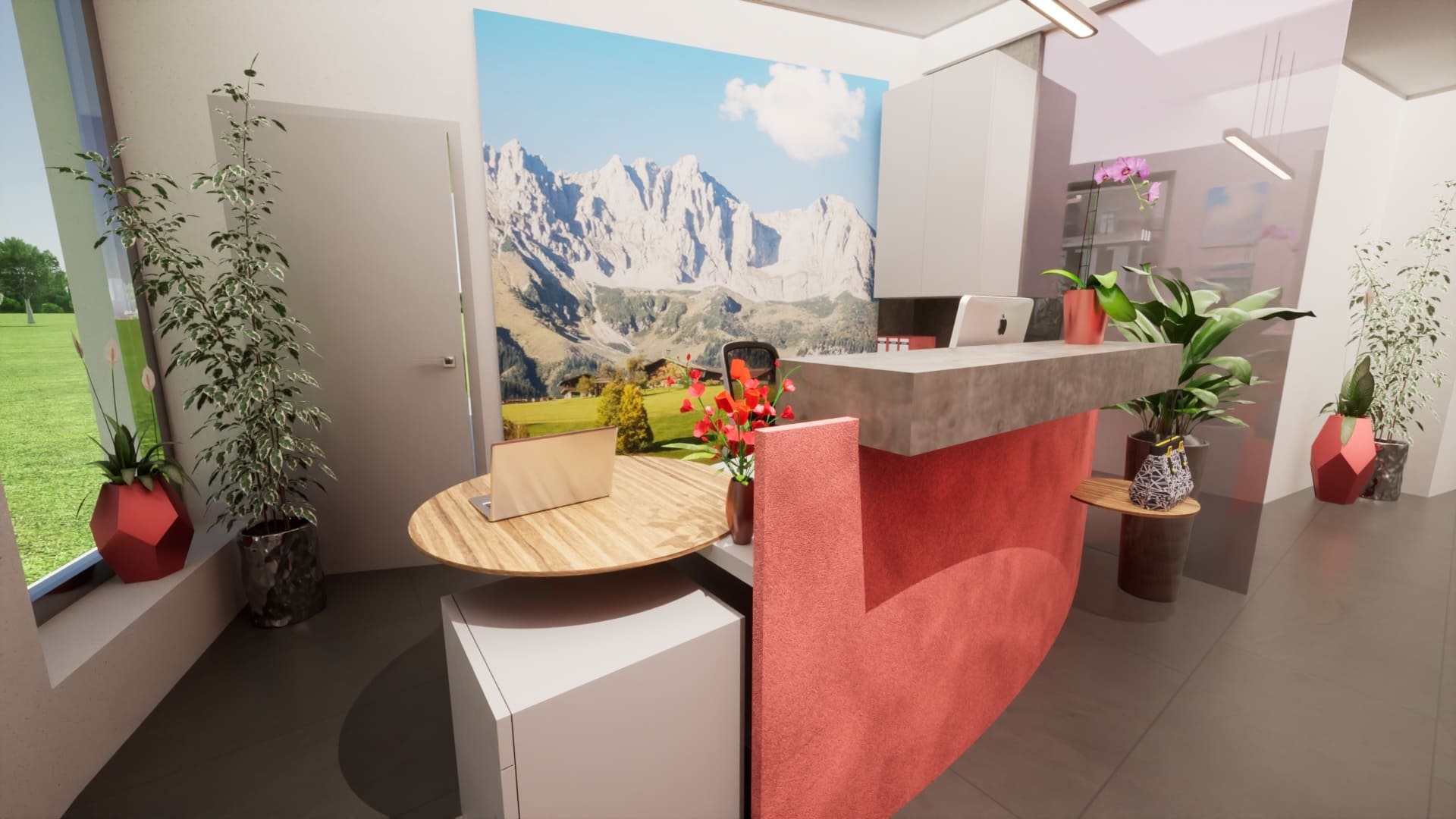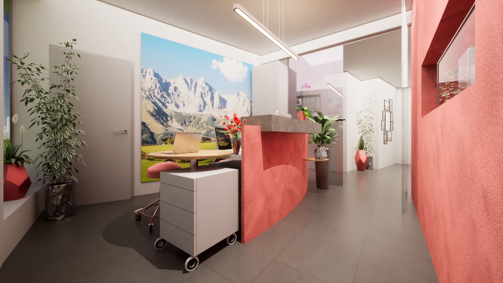 Der Empfangstresen aus maßgefertigten Möbeln kombiniert eine Arbeitsfläche in Betonoptik mit einem geschwungenen Korpus in einem gedämpften Rotton, der warm genug ist, um einzuladen, und präzise genug, um Professionalität zu signalisieren. Holzelemente, Glas und Edelstahldetails ergänzen das Bild und halten das Konzept in einer Spannung, die lebendig wirkt, ohne unruhig zu werden.