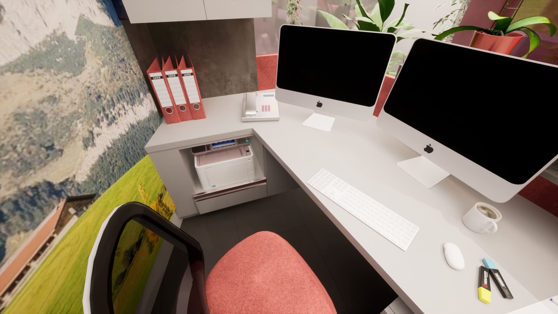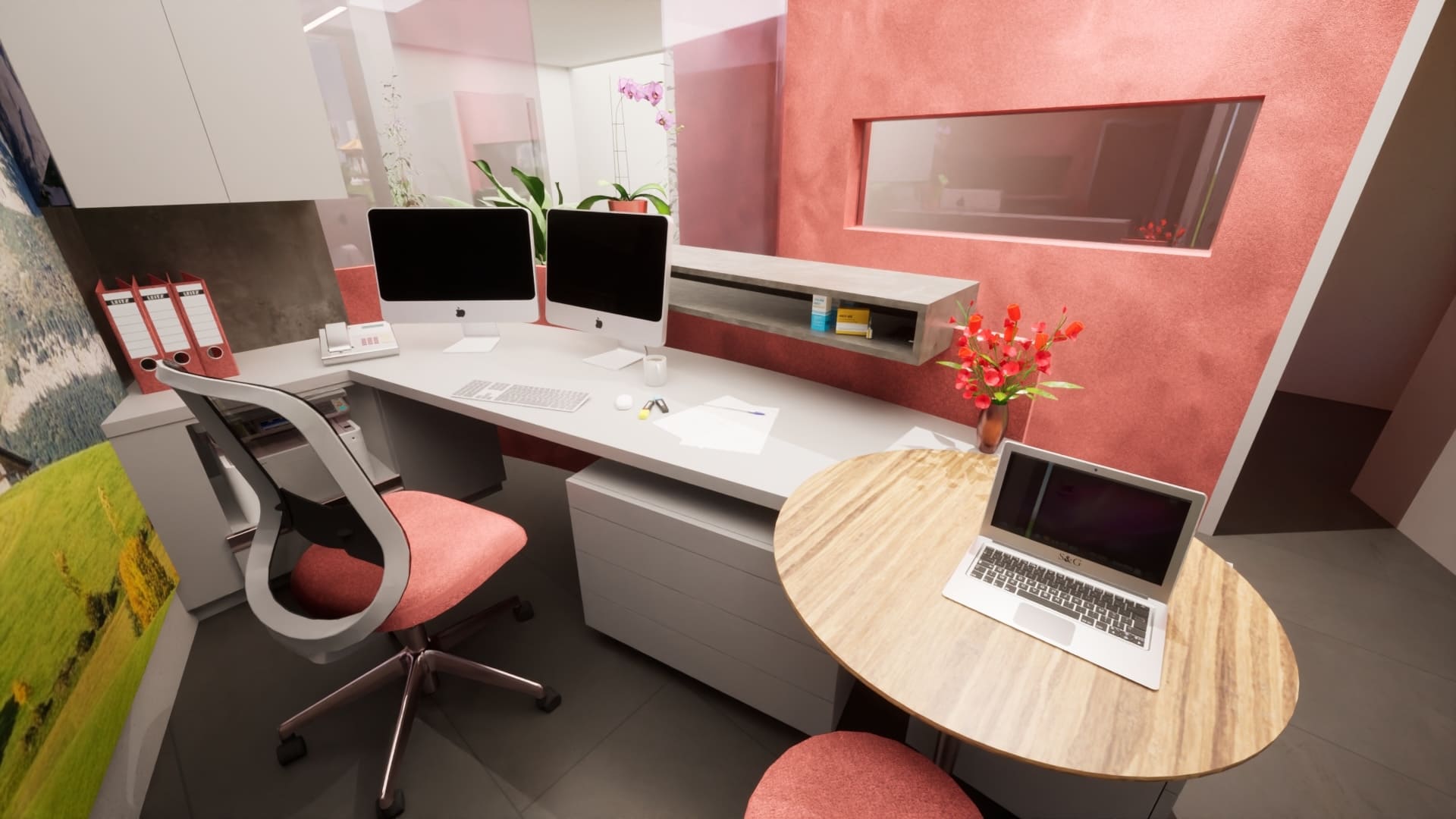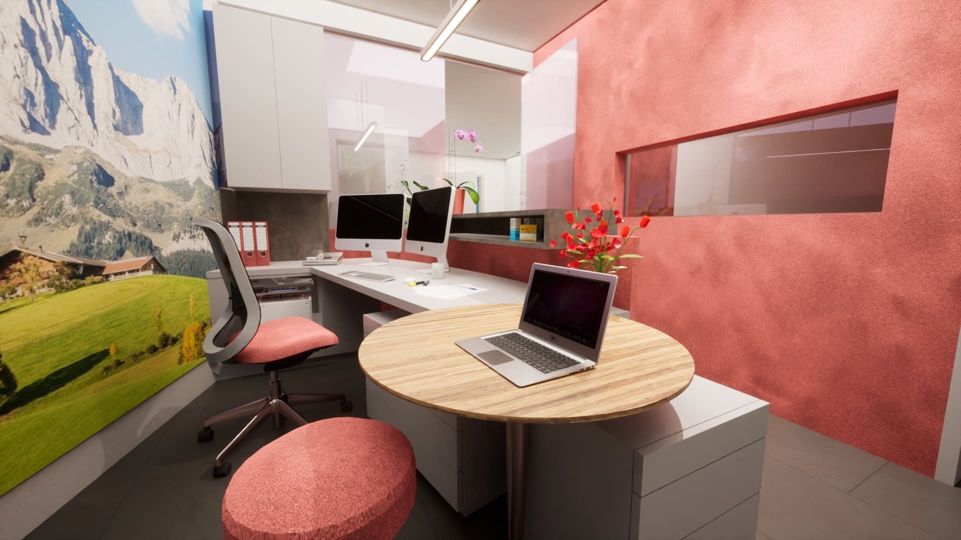 Der Empfangstresen aus maßgefertigten Möbeln kombiniert eine Arbeitsfläche in Betonoptik mit einem geschwungenen Korpus in einem gedämpften Rotton, der warm genug ist, um einzuladen, und präzise genug, um Professionalität zu signalisieren. Holzelemente, Glas und Edelstahldetails ergänzen das Bild und halten das Konzept in einer Spannung, die lebendig wirkt, ohne unruhig zu werden.