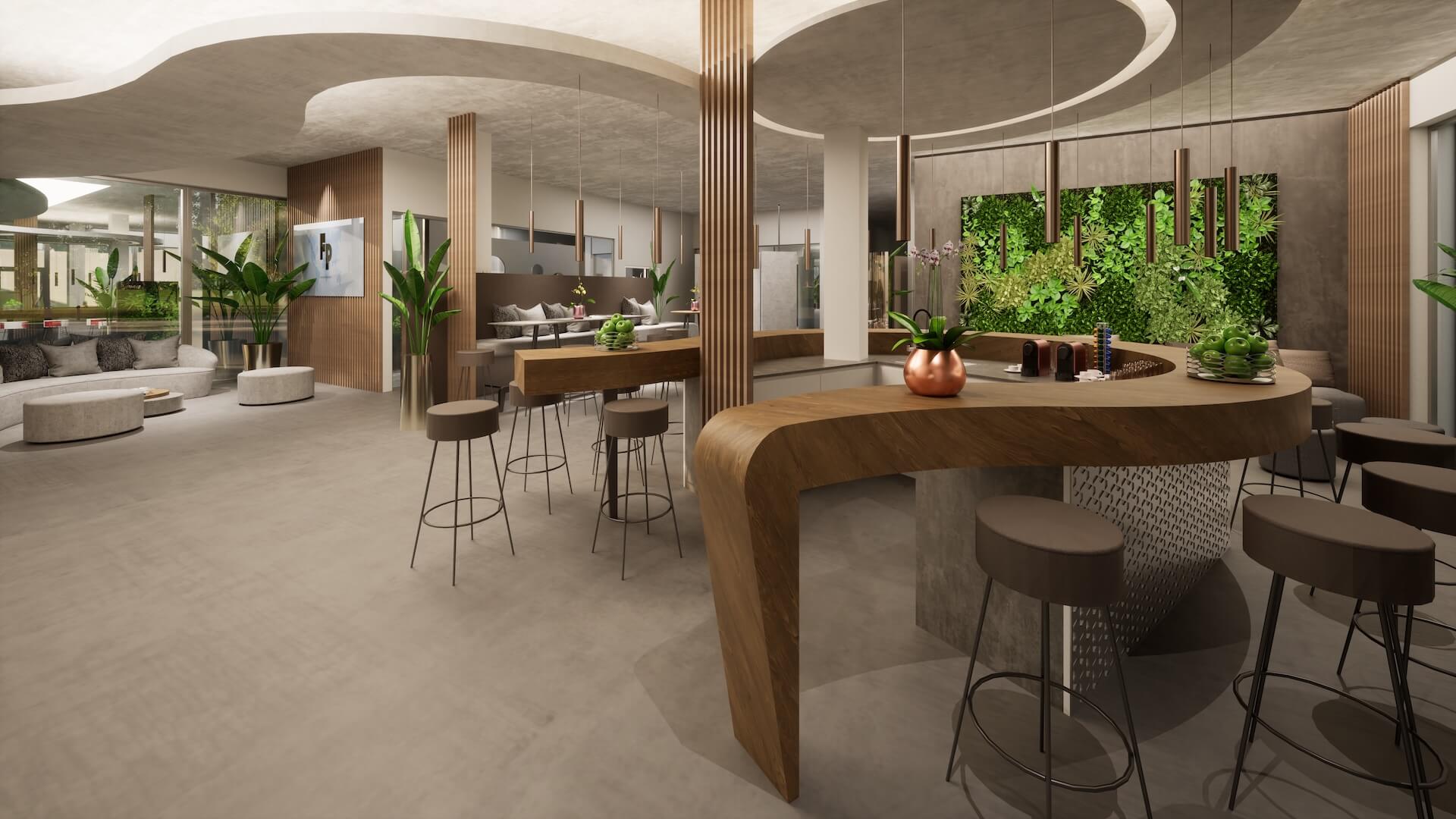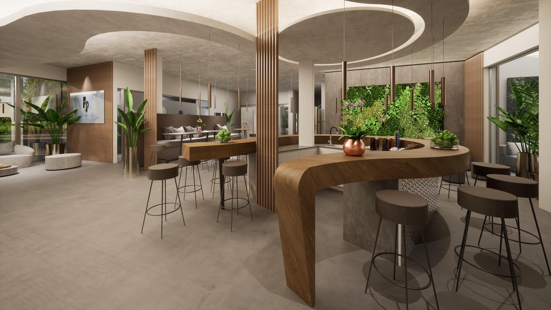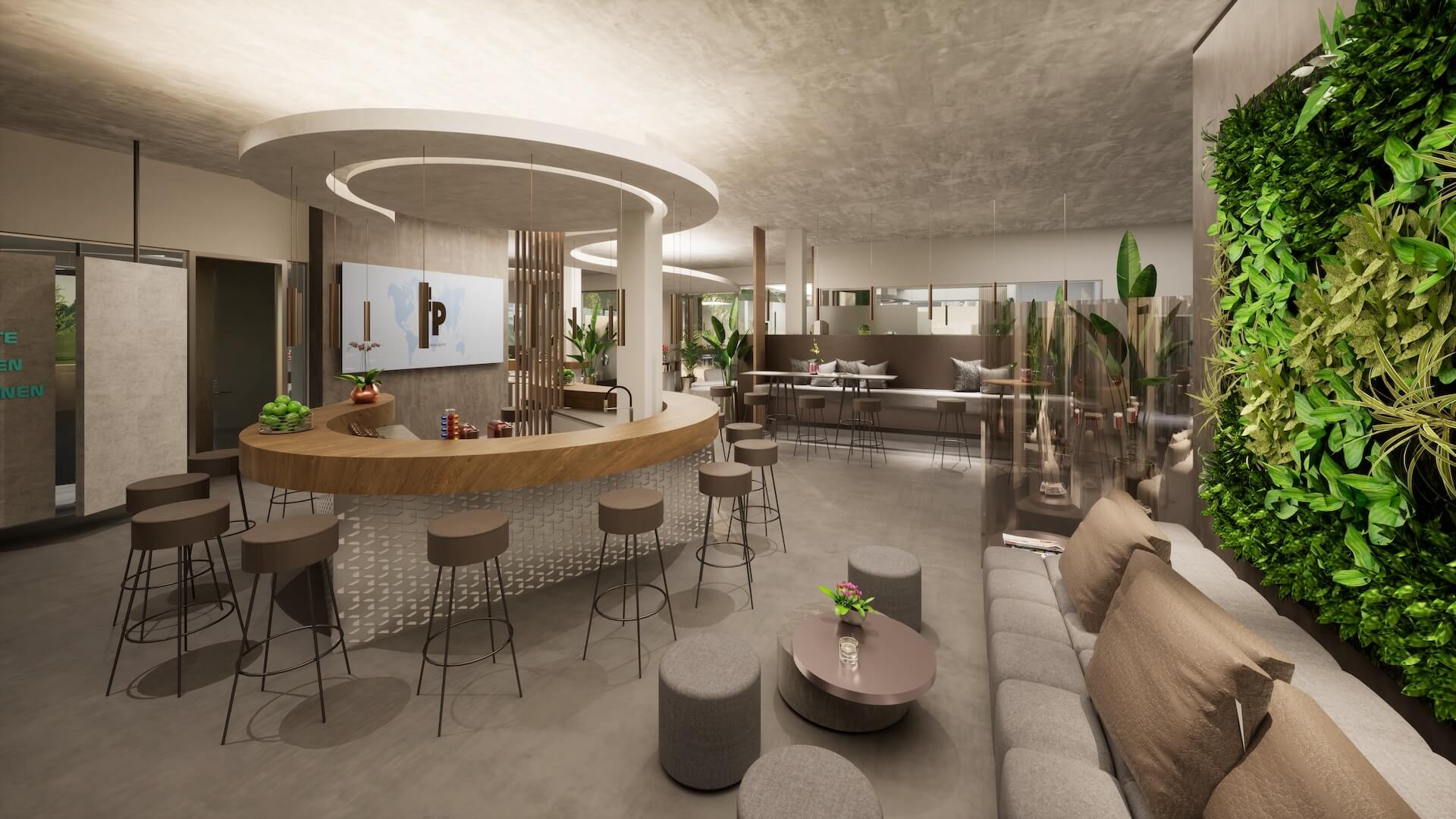 Als Hintergrund zur Bar wurde eine begrünte Pflanzenwand gesetzt: Satte Grüntöne in unterschiedlichen Strukturen und Texturen bilden einen lebendigen Kontrast zum warmen Holz des Tresens. Diese Wand ist kein Dekorationsstück – sie ist ein bewusstes Statement für die Firmenkultur: Wachstum, Lebendigkeit, Nachhaltigkeit.
