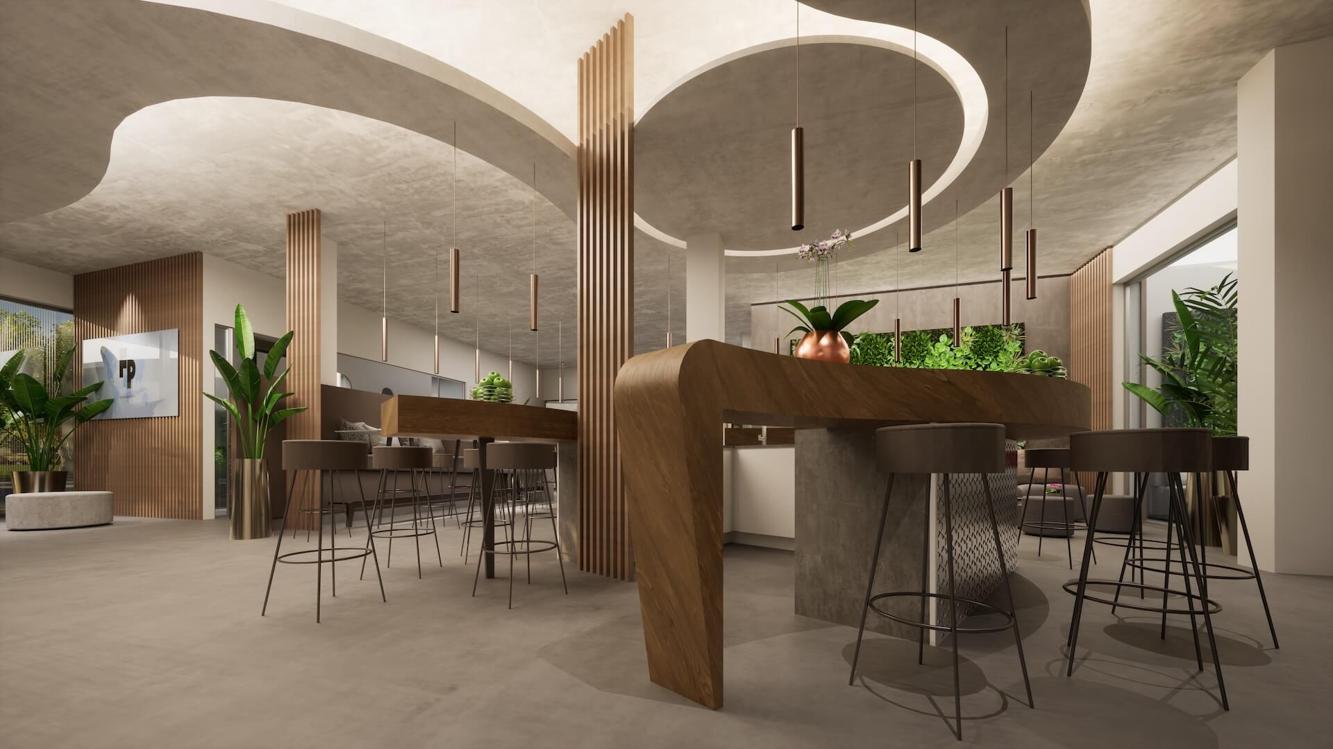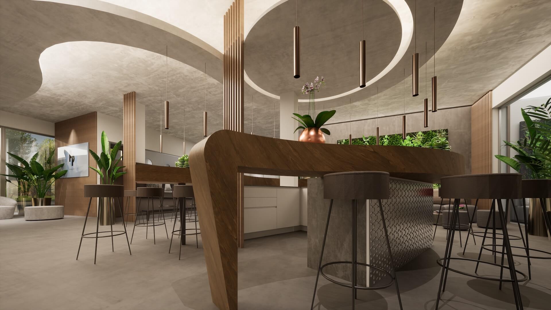 Was den Raum über den Tresen hinaus definiert, ist das Deckenkonzept: Ein dreiteiliger Kreis aus abgehängten Deckenelementen mit integrierter, indirekter Beleuchtung umschließt die Bar von oben. In der Mitte hängen kupferfarbene Pendelleuchten als feines Akzent-Ensemble herab. Die kreisförmige Decke schafft ein „Zimmer im Zimmer” – ohne trennende Wände entsteht eine klare Zugehörigkeit.