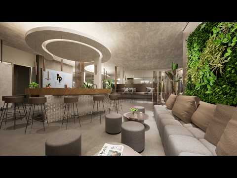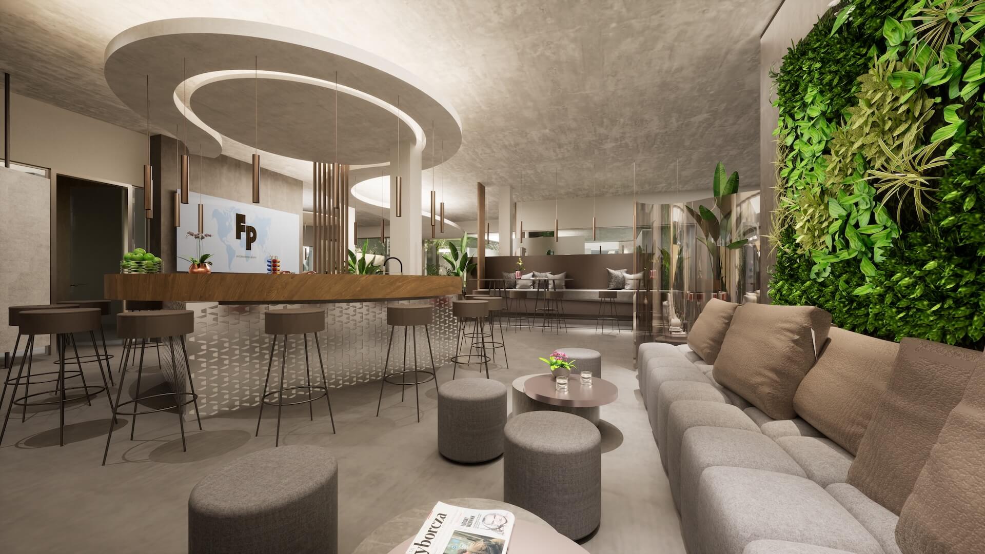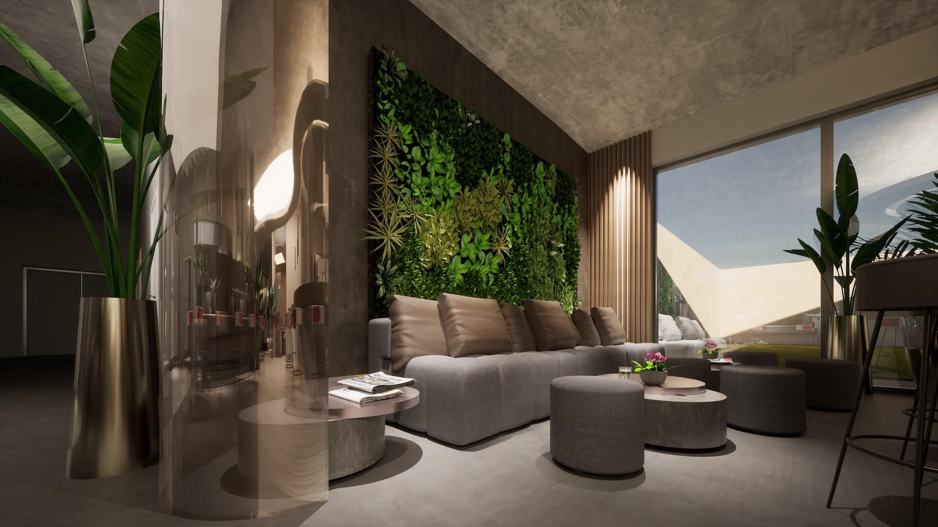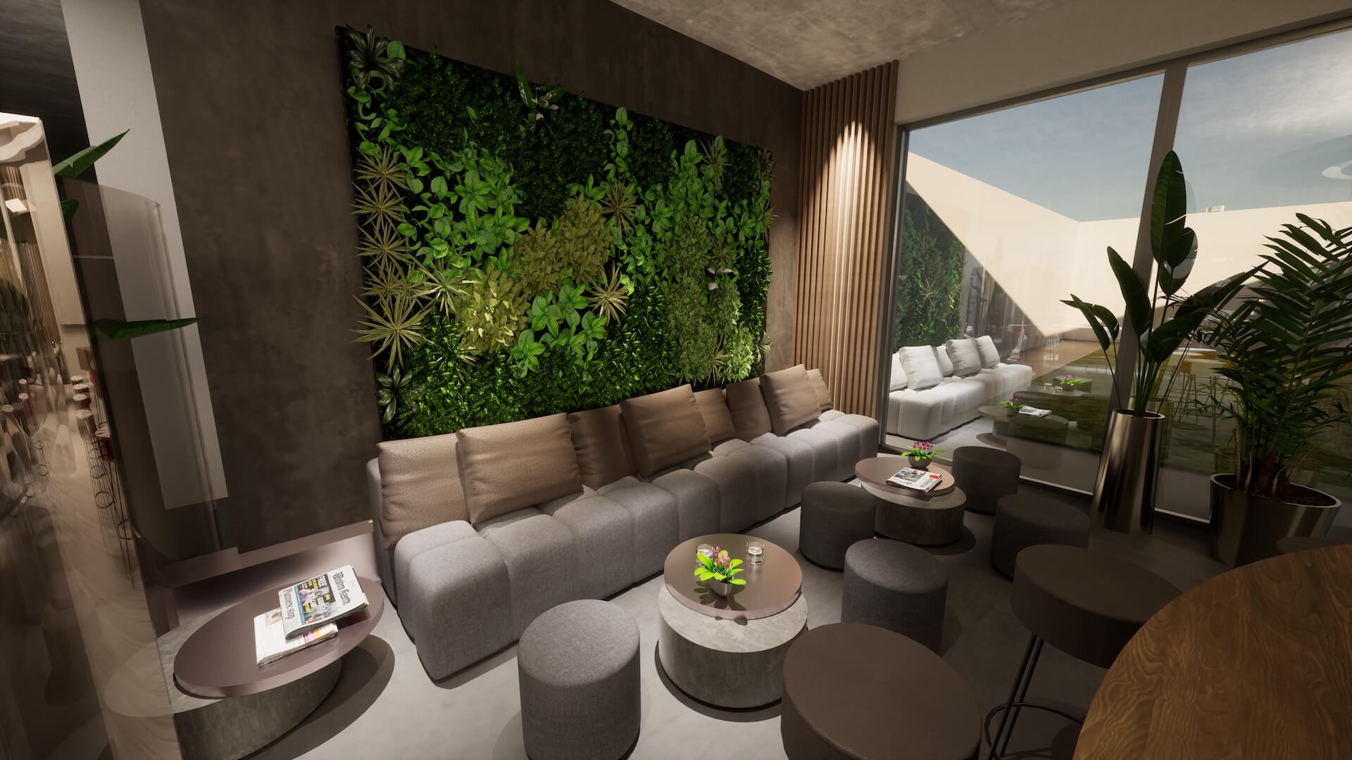 An der längsten Wand des Begegnungsbereichs erstreckt sich eine raumhohe begrünte Pflanzenwand. Die dichte Vegetation aus unterschiedlichen Blattstrukturen und Grüntönen schafft eine akustisch beruhigende Atmosphäre – und macht deutlich, dass hier ein anderer Modus gilt: kein schnelles Informieren, sondern echtes Zuhören.