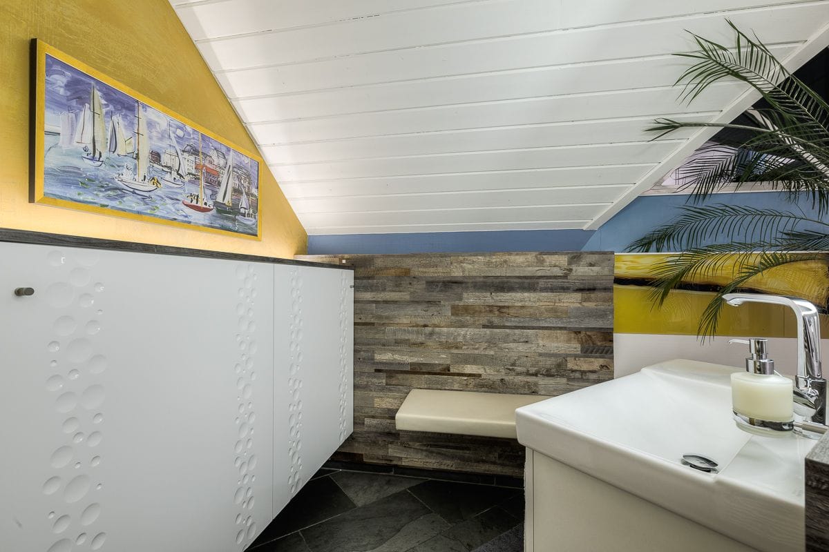 Praxis-Tipp: Fotodrucke auf Aluminiumplatten aufgezogen oder Digitaldrucke auf Glas eignen sich besonders gut für langlebige Bildgestaltungen in Badezimmer und Nassbereichen. Ersteres können Sie auf den Fotos über dem WC und Zweiteres im Wannenbereich sehen.