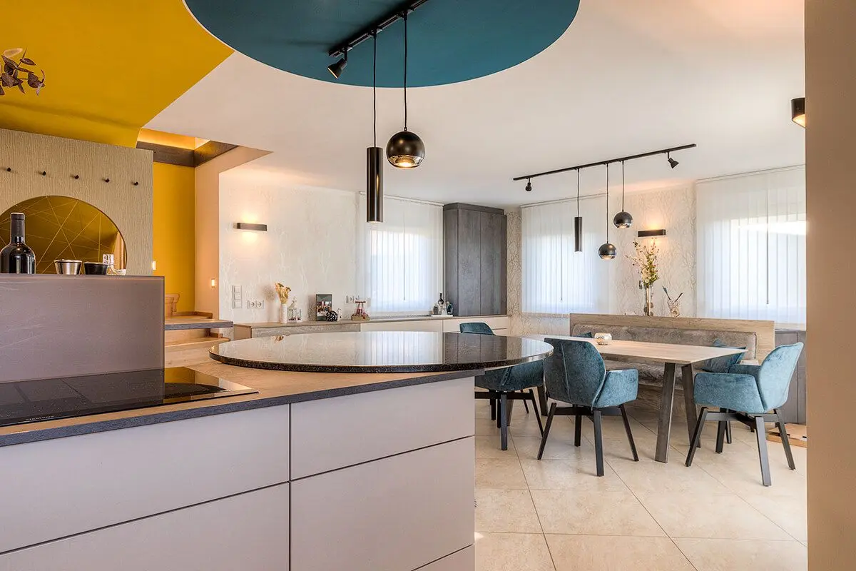 Die gesamte Einrichtung ist in neutralen Farben gehalten und durch farbige Akzente aufgepeppt worden. Zu den petrolfarbenen Sesseln rund um den neuen Esstisch haben wir uns für ein kräftiges Senfgelb als Kontrast entschieden. Farbelemente findet man nur an Wänden und Decke damit, wenn sich der Farbgeschmack einmal ändert, diese Bereiche ohne Probleme andersfarbig überpinselt werden können.