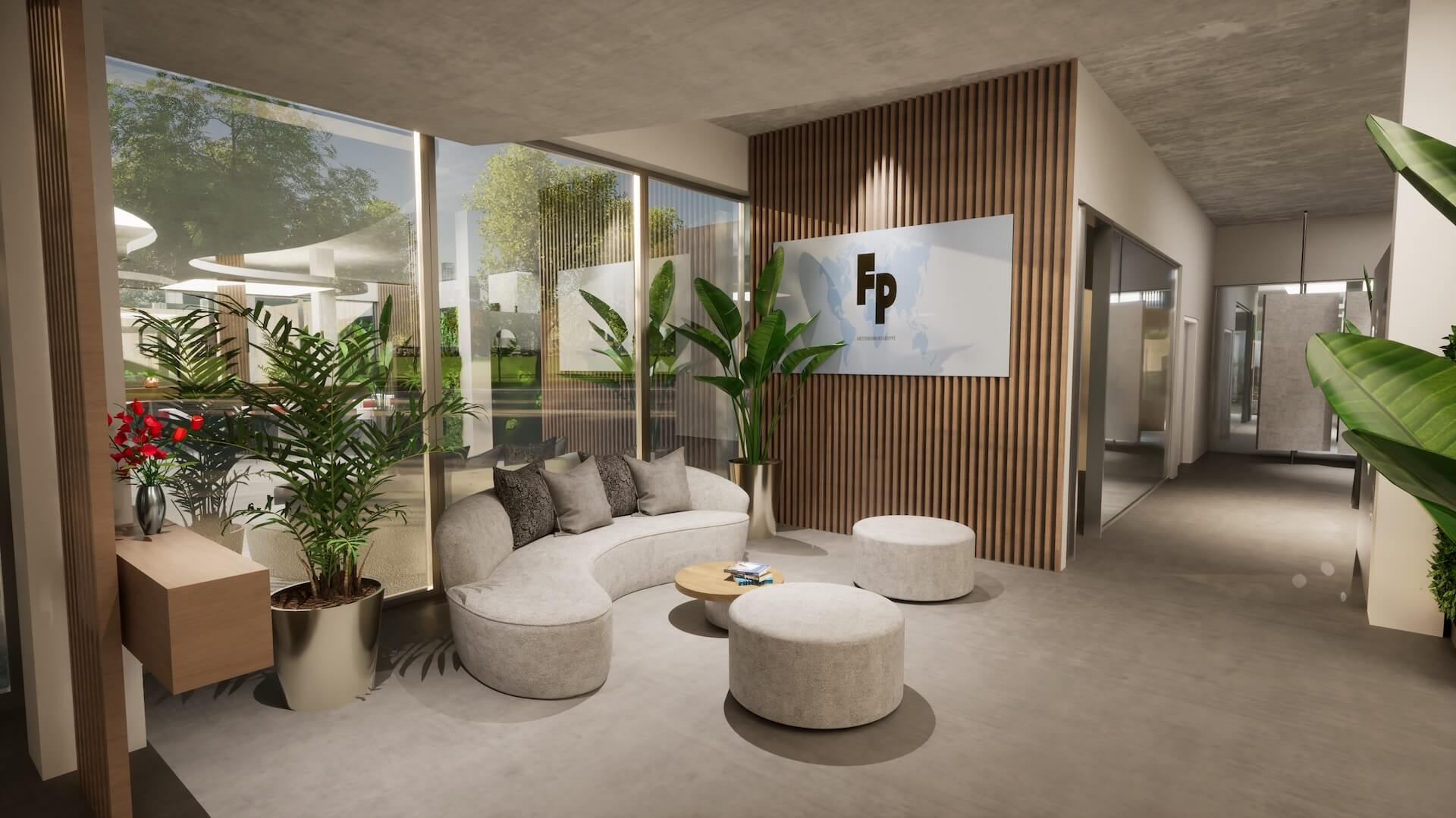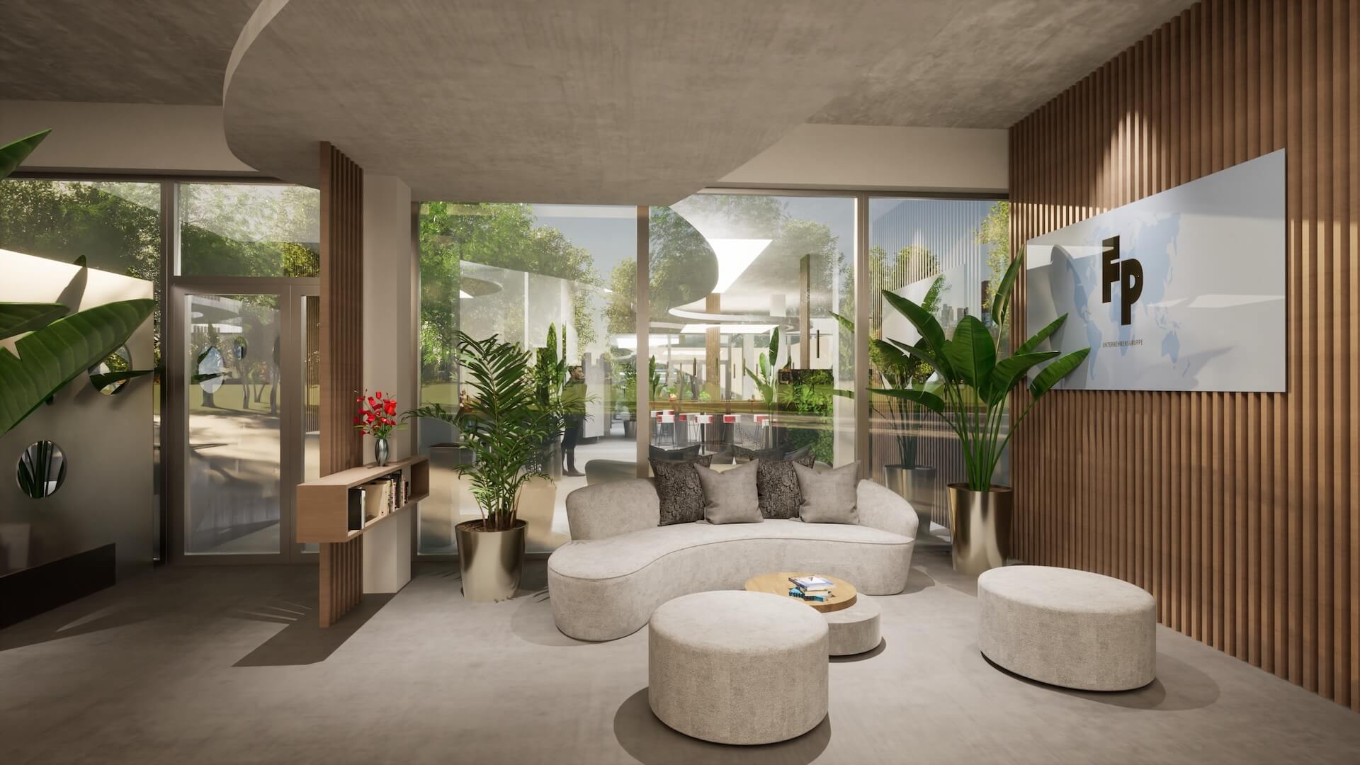 Die Wand hinter dem Sofa ist mit vertikalen Holzlamellen in warmem Naturton verkleidet. Sie gibt dem Raum Tiefe und Wärme, ohne den hellen, lichtdurchfluteten Charakter des Raums zu schwächen. Die großen Glasfronten öffnen den Blick nach außen – ins Grüne, ins Tageslicht. Das Firmenlogo ist integriert, aber zurückhaltend: Präsenz ohne Aufdringlichkeit.