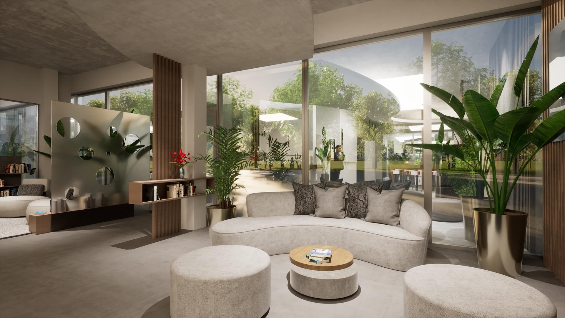 Der Wartebereich dieses Firmengebäudes setzt diesen Ton mit Absicht. Im Zentrum steht ein geschwungenes, organisch geformtes Sofa in hellem Bouclé-Stoff. Seine weiche, fließende Linie kontrastiert bewusst mit der sachlichen Strenge, die viele Unternehmenslobby-Konzepte prägt. Ergänzt durch runde Polsterhocker und flache Beistelltische entsteht ein Sitzbereich, der an eine gehobene Hotelhalle erinnert – ohne den Abstand zu erzeugen, den ein Hotellobbystil manchmal mitbringt.
