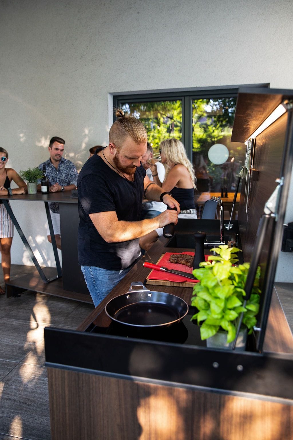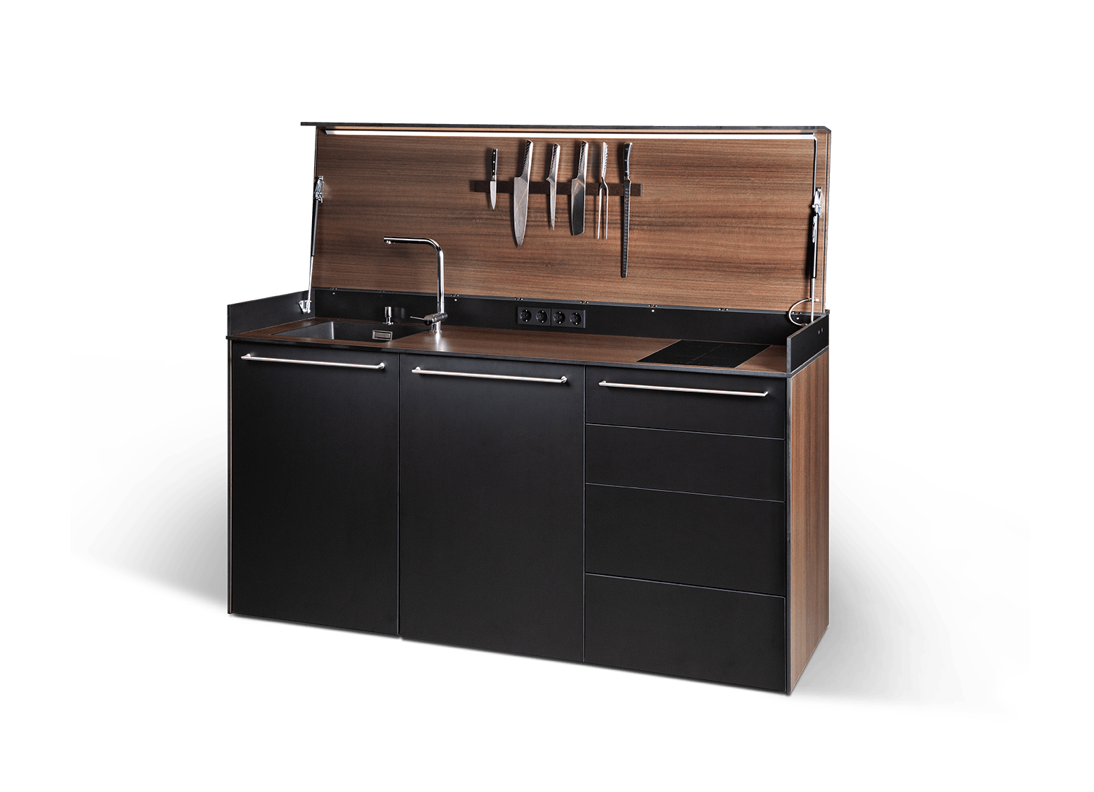 Beim Design der kompakten Outdoor-Küche wurde viel Liebe zum Detail bewiesen und gleichzeitig auf höchste Funktionalität geachtet. Sie bietet alles was man für einen perfekten Grillabend benötigt: jegliches Grillzubehör immerzu griffbereit, genügend Arbeitsfläche zum Zubereiten leckerer Schmankerl, eisgekühlte Getränke stets bei der Hand und sogar Familie und Freunde finden rundherum ein gemütliches Plätzchen.