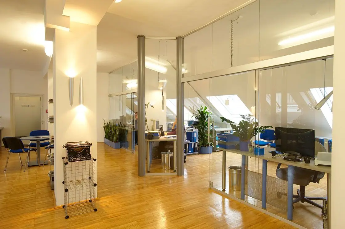 Der wahrscheinlich kniffligste Punkt bei Großraumbüros ist die Akustik. Das Wichtigste, um die Lärm- und Schallbeeinträchtigung zu minimieren, ist die richtige Auswahl und Platzierung qualitativ hochwertiger Materialien. Generell absorbiert natürlich ein Teppichboden mehr Störgeräusche als andere Materialien, wie zum Beispiel ein Parkettboden. Jedoch wird Lärm und Schall Großteils über Decke und Wände übertragen. Deshalb ist eine optimal eingesetzte Kombination aus gut absorbierenden Materialien für den gesamten Raum notwendig. Um nicht nur dem Gesetz, sondern auch dem einzelnen Mitarbeiter Genüge zu tun, ist eine sorgfältige Akustikplanung unter Betrachtung der jeweiligen Anforderungen und Tätigkeiten der Mitarbeiter erforderlich. Das erste Bild zeigt das Büro der Werbeagentur Hauska Wien – die einzelnen Mitarbeiter brauchen meist Ruhe beim Arbeiten, deshalb hat jeder seinen eigenen Raum. Damit Sie trotzdem nicht gänzlich voneinander abgeschottet sind, wurde mit viel Glas gearbeitet.
