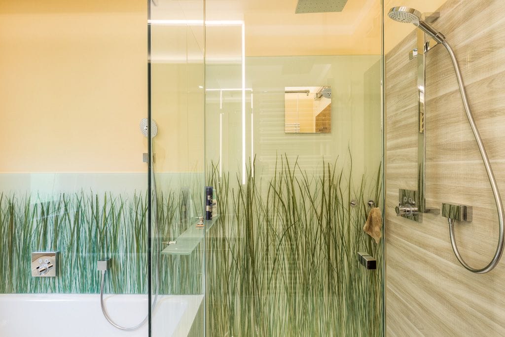 Des Weiteren wurden, als speziell dekorative und funktionelle Elemente, für die Rückwände der Badewanne und des Duschbereichs „glass-inspiration“ Paneele des österreichischen Unternehmens HALE mit Echtgraseinlage verwendet. Bei „glass-inspiration“ handelt es sich um ein neu entwickeltes Verbundsicherheitsglas, in welches durch ein spezielles Herstellungsverfahren verschiedene Einlagen zwischen zwei Glasplatten eingebracht und mit dem Glas untrennbar verbunden werden. Der besondere Vorteil dieser Paneele ist einerseits die leichte Reinigung ohne die Einlage zu beschädigen und andererseits bieten sie Schutz vor Staub, Nässe und Temperatureinflüssen.