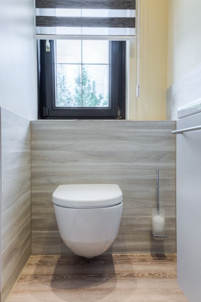 Speziell in den Nassbereichen und im Vorraum wurde mit innovativen und neueren Materialien gearbeitet. Im Badezimmer und den WCs wurden anstatt von Fliesen Vinylböden und Resopal-Platten für die Wandverkleidung verwendet. Vinylböden gibt es mittlerweile auch in der Optik von Holzböden und bieten somit eine wärmere und weichere Oberfläche als Fliesenböden. Sie sind dennoch robuster und zu 100% wasserresistent, wodurch sie auch für Nassbereiche optimal einsetzbar sind. Derselbe Vinylboden wurde im gesamten Wohnraumbereich verwendet, um ein einheitliches Gesamtbild zu schaffen. Für die Wandverkleidungen der Nassbereiche wurden großformatige und ultraleichte RESOPAL SpaStyling Boards verwendet, welche sehr robust, hygienisch und leicht zu reinigen sind. Durch die große Auswahl an verschiedenen Dekoren dieser Platten konnte ein stimmiges Gesamtraumkonzept umgesetzt werden.