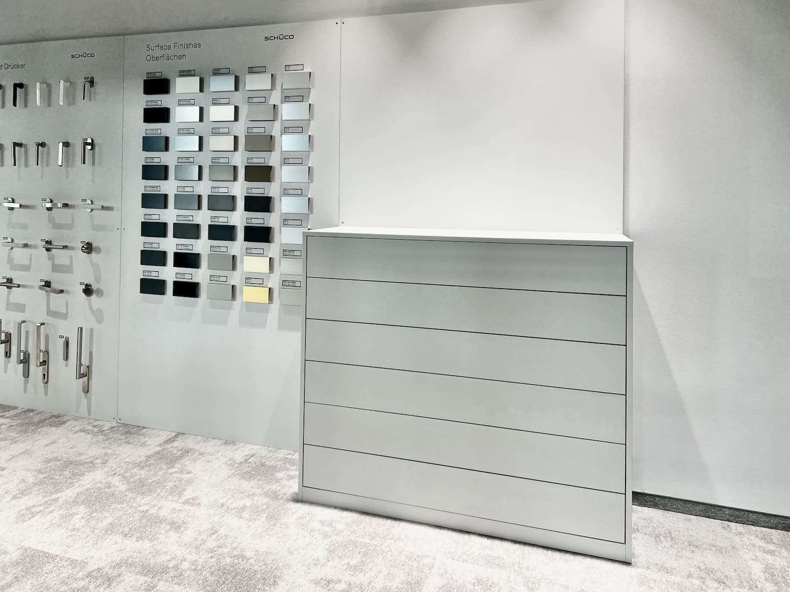 Jeder der drei Räume ist mit einer individuellen, großen Bildcollage bestückt, die verschiedene Gebäudefassaden zeigt, die von AluKönigStahl konzipiert und gebaut wurden.