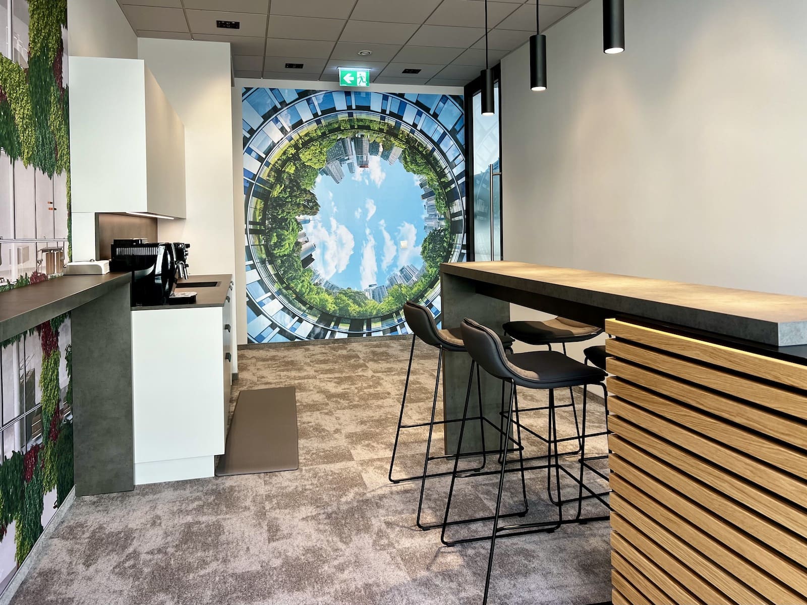 Neben dem großen Meetingraum befindet sich dieser kleinere interessant gestaltete Raum, der mit einer Küchenzeile ausgestattet ist. Hier können sich Kunden, Gäste und auch die Mitarbeiter in angenehmer Atmosphäre treffen, verköstigen und auch mal eine Besprechung abhalten. Das Besondere an diesem Raum sind die kreativen Designelemente: