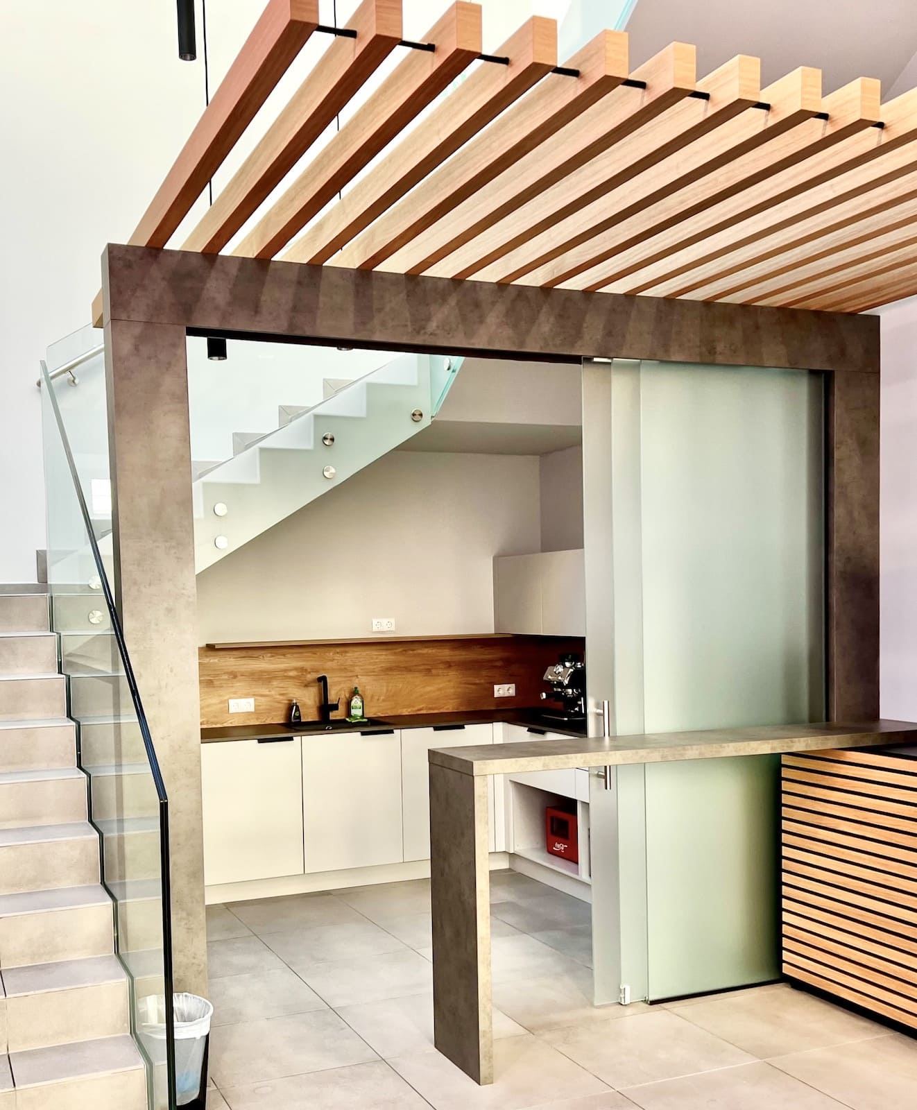 Eine kleine Küche unterhalb der Treppe macht durch ihr offenes Design richtig was her und wird von Mitarbeitern gerne angesteuert. Möchte man nicht auf die Küchenzeile schauen, lässt sich der ganze Bereich mit 3 mattierten Glasschiebetüren komplett verdecken. Schön auch der große Bildschirm an der Wand und das einfallende Licht durch das große Glasdach im ersten Stock.