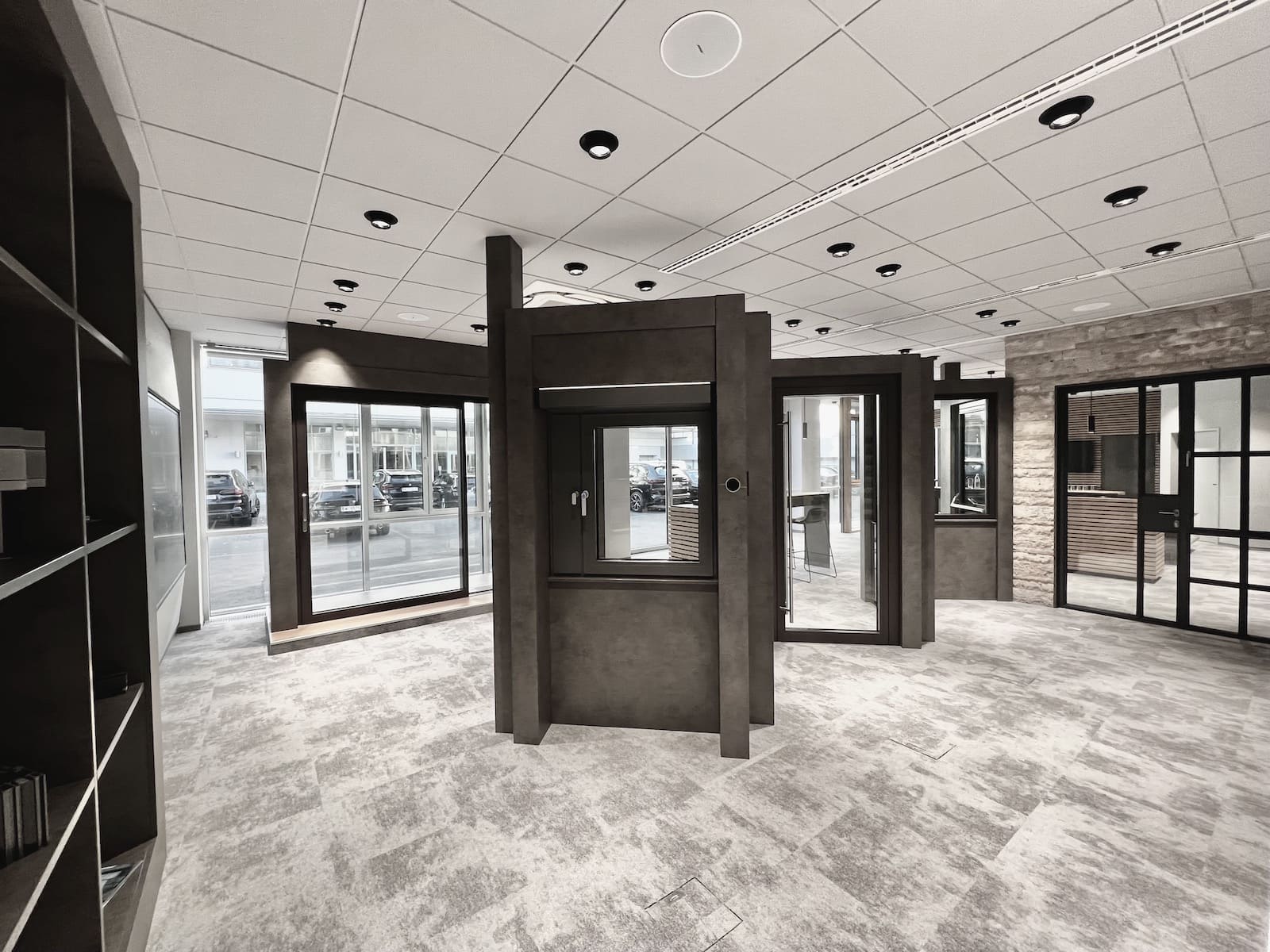 Der Umbau der Firmengebäude war von Anfang an darauf ausgerichtet, ein durchgängiges Erlebnis für Kunden und Partner zu schaffen. Bereits beim Betreten des Hauptgebäudes markiert die offene Treppe den Zugang zu einem völlig neuen Empfangsbereich, der sich von der vorherigen Gestaltung grundlegend unterscheidet (siehe Video mit Vorher-Bild). Helligkeit und Freundlichkeit prägen nun das Ambiente, während das Logo von AluKönigStahl und seinen international führenden Partnern Schüco und Jansen deutlich sichtbar sind.