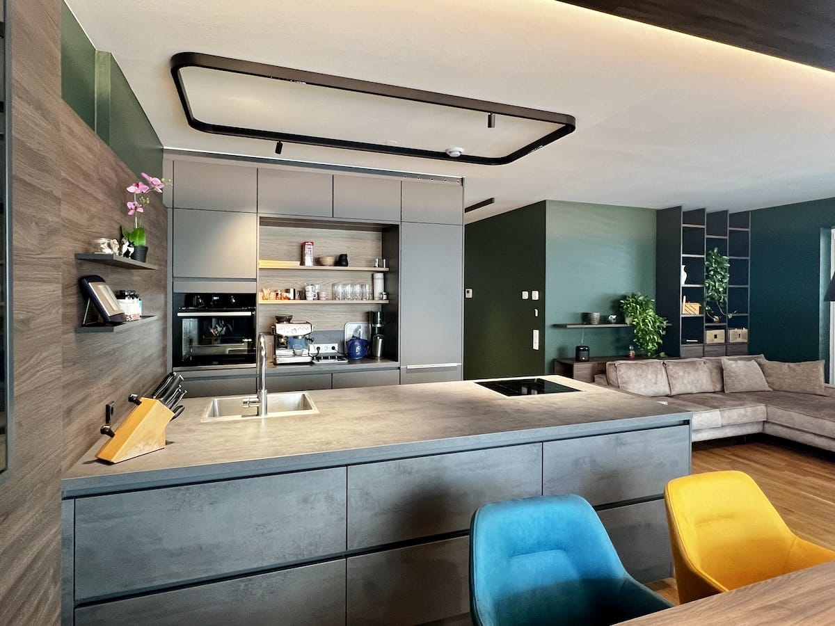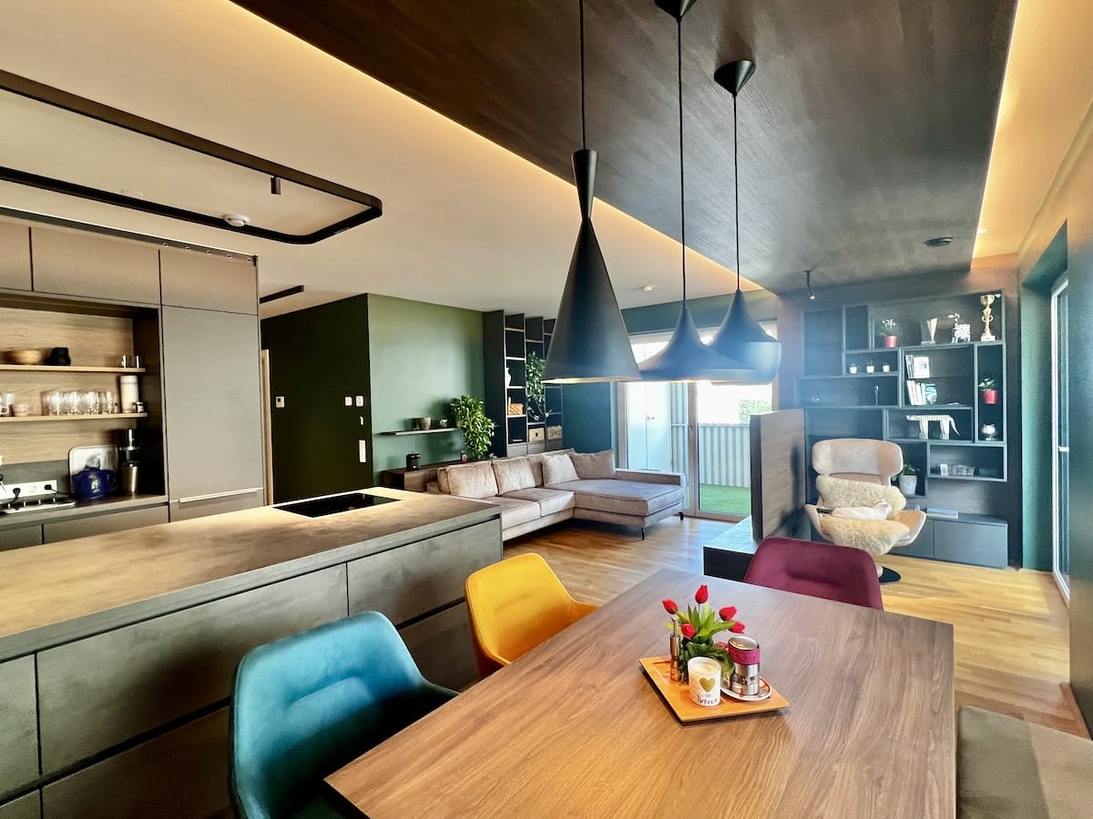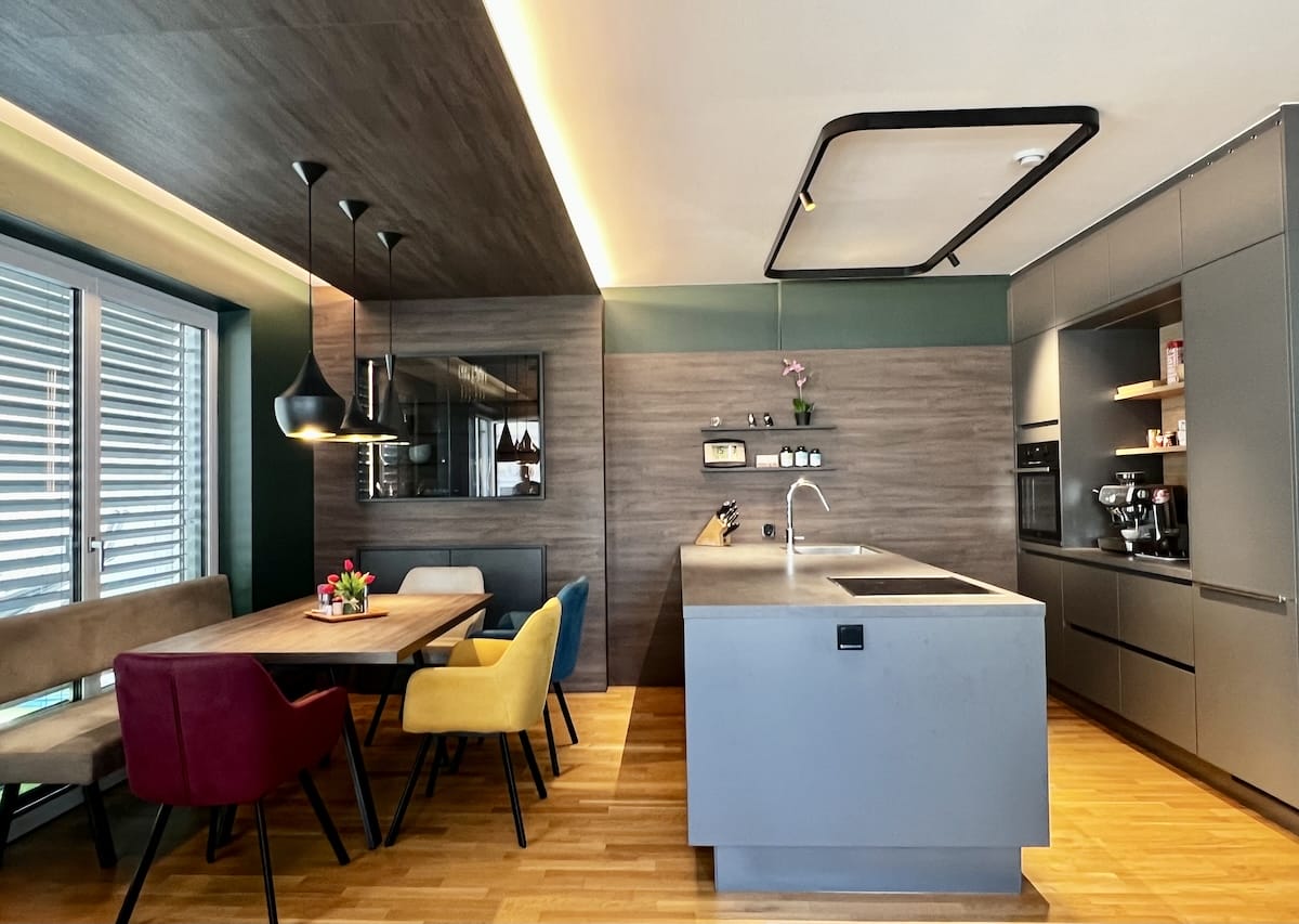 Bei diesem Ausbauprojekt hatte sich der Sohn eher dunkle Farben für Wände und Möbel gewünscht, was bei den Eltern zuerst auf Skepsis stieß. Doch die Planung unseres Innenarchitekten Qerim (sprich Scherim) und die Umsetzung durch Günther und das Maler- und Tischlerteam hat gezeigt, wie schön dunkle Farben wirken können und wie gut die Räume zur Geltung kommen. Das Ergebnis hat alle überzeugt. Die Farben harmonieren supergut im Einklang mit allen Einbauten und Möbeln und durch verschiedene kreative Lichtlösungen wirken die Räume hell, warm und gemütlich.