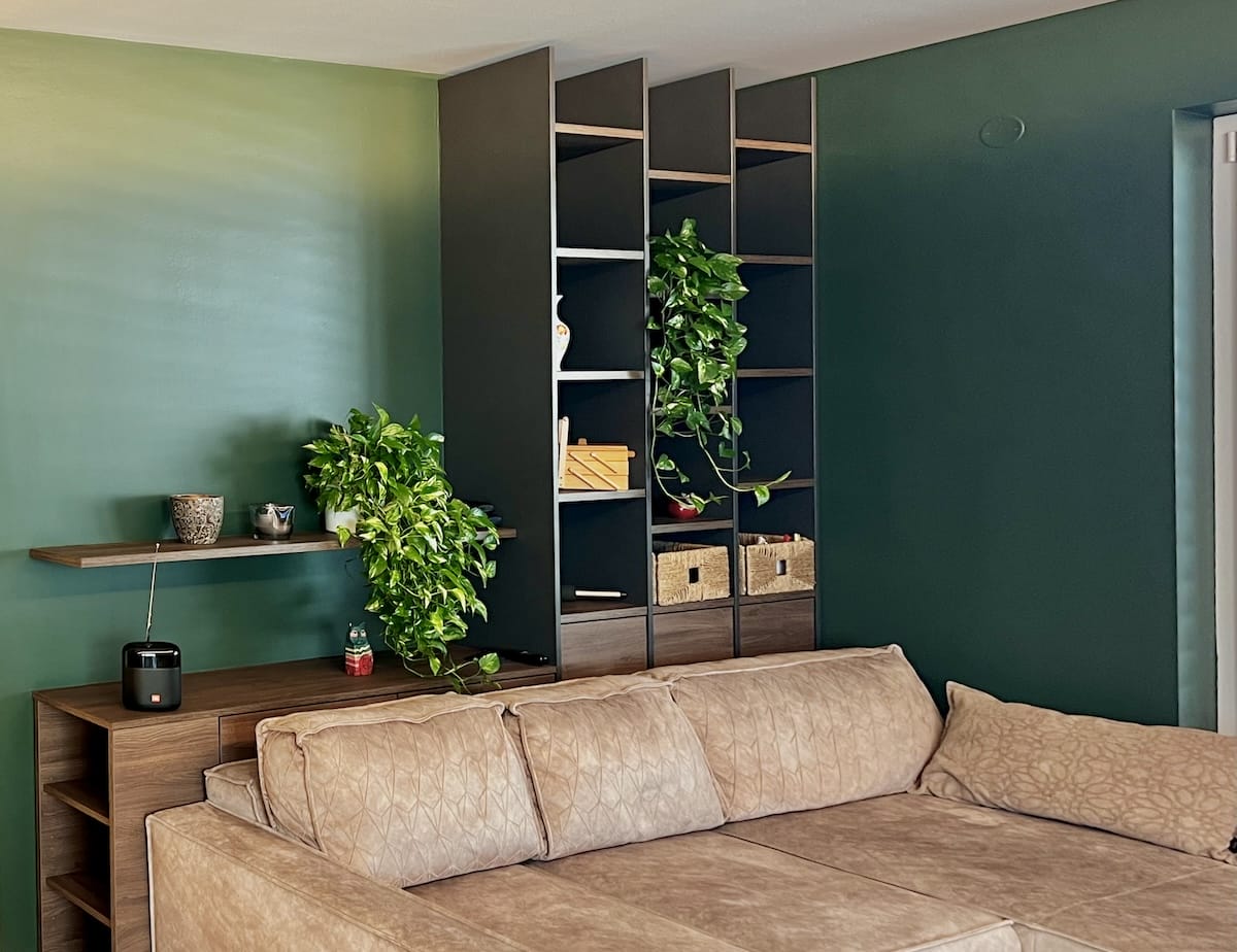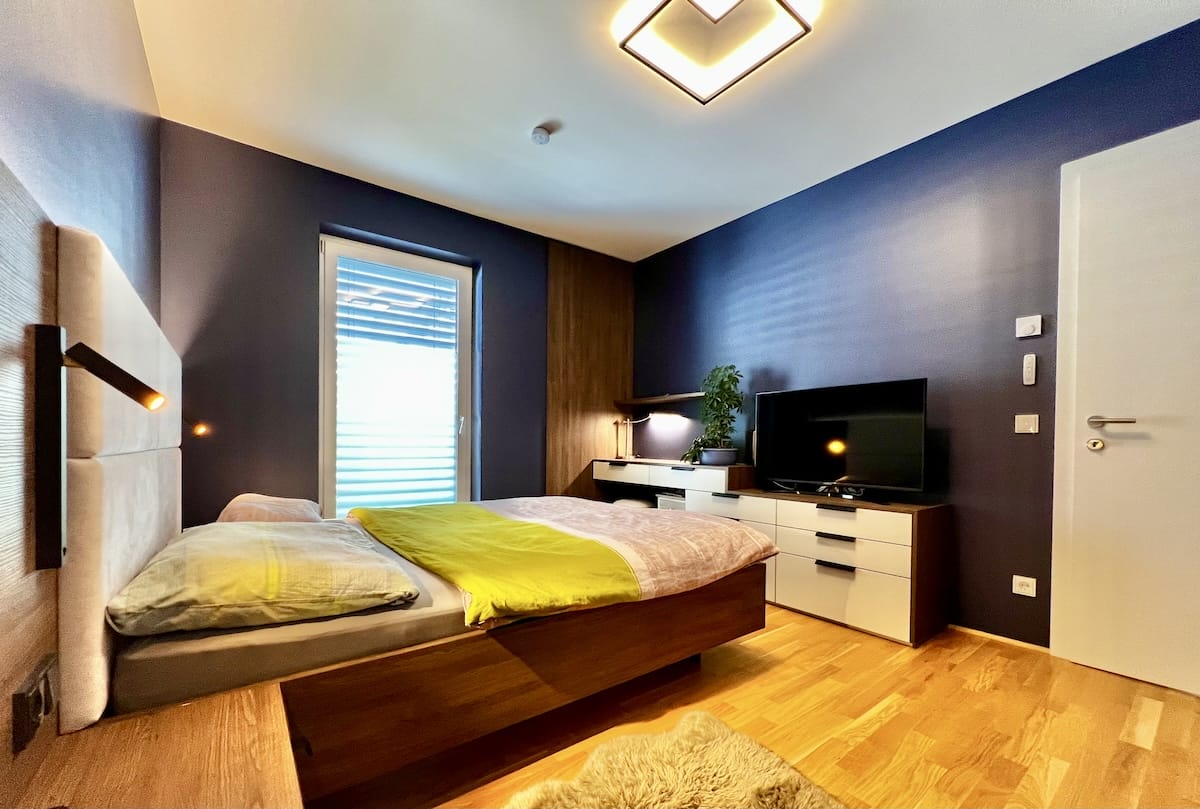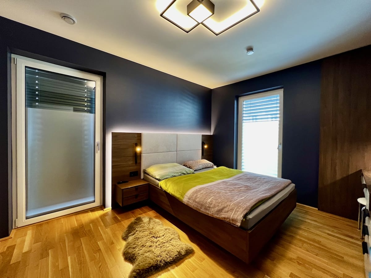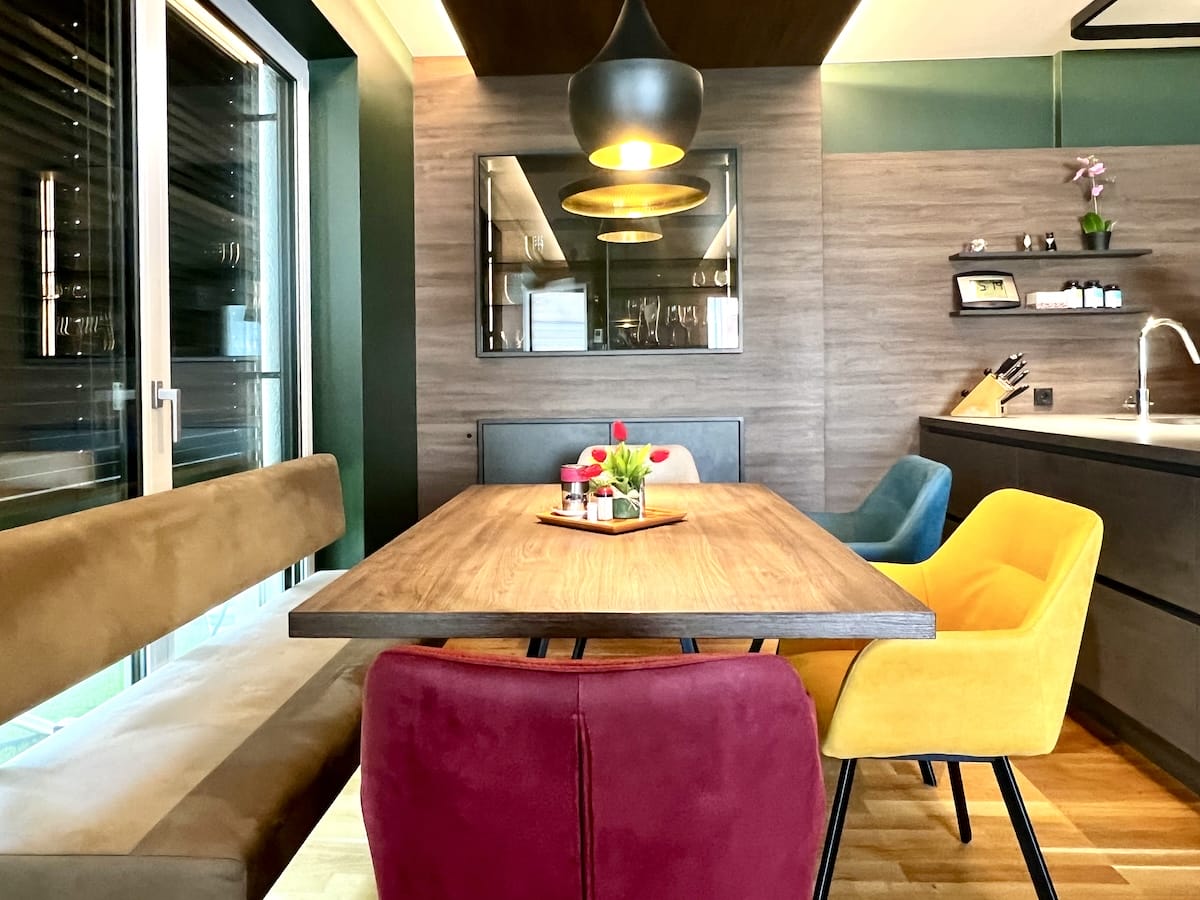 Bei diesem Ausbauprojekt hatte sich der Sohn eher dunkle Farben für Wände und Möbel gewünscht, was bei den Eltern zuerst auf Skepsis stieß. Doch die Planung unseres Innenarchitekten Qerim (sprich Scherim) und die Umsetzung durch Günther und das Maler- und Tischlerteam hat gezeigt, wie schön dunkle Farben wirken können und wie gut die Räume zur Geltung kommen. Das Ergebnis hat alle überzeugt. Die Farben harmonieren supergut im Einklang mit allen Einbauten und Möbeln und durch verschiedene kreative Lichtlösungen wirken die Räume hell, warm und gemütlich.