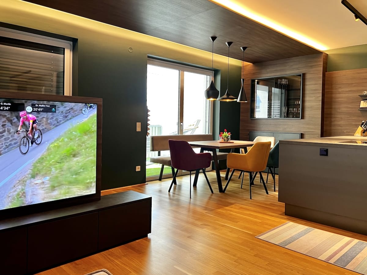 Dazu kamen Wandverkleidungen, um Verbindungen und fließende Übergänge zwischen den Zonen zu schaffen. Besonders die abgehängte Holzdecke mit der indirekten Lichtgebung hat den Kunden gut gefallen, da diese vom Esszimmer bis in die Leseecke reicht und optisch einen schönen Verbindungsbogen darstellt.