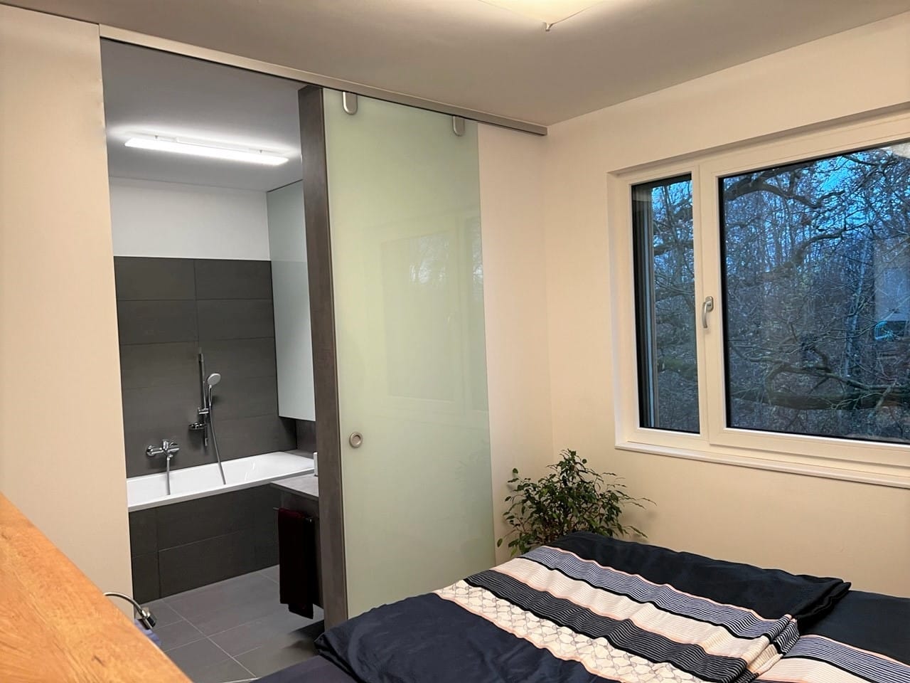 Hinter dem Kopfteil des Bettes sieht man auch hier wieder eine transluzente (lichtdurchlässige) Glasschiebetür, die den Raum zum Flur abtrennt. Schließt man sie, sorgt die Verspiegelung für mehr Raumtiefe, indem sie das Tageslicht vom Fenster reflektiert.