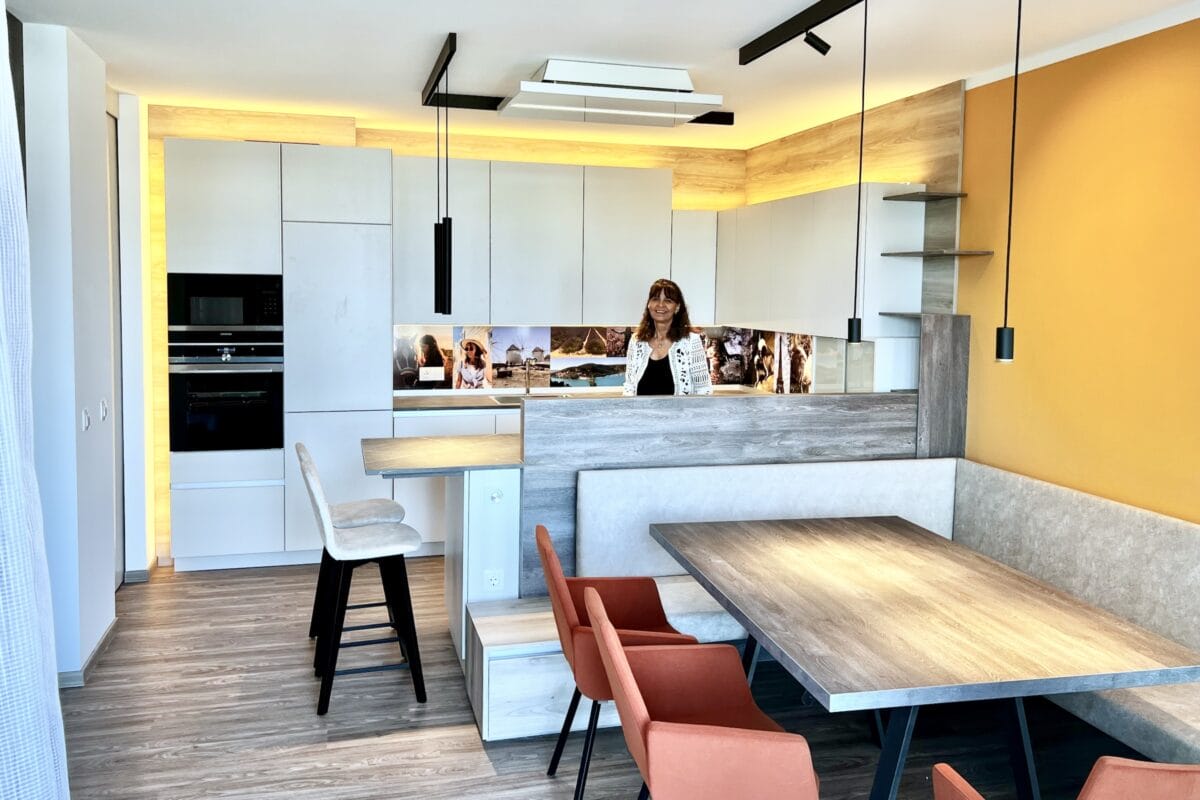 Wenn Birgitt jetzt die fertige Wohnung anschaut und durchgeht, sieht sie genau jene Ideen und Lösungen verwirklicht, die ihr am Anfang durch den Kopf gingen. Beispielsweise wurden ihre Lieblingsfotos zur Vorlage für wunderschöne Wandfliesen hinter den Küchenarbeitsflächen – ein echter Hingucker! Auch alltägliche Dinge, wie die Unterbringung eines Sicherungskastens wurde sehr kreativ durch das Verbauen hinter einem Wandpaneel gelöst. Tolle Schrankeinbauten und die Möglichkeit, ihren Wohnbereich vom Essbereich durch einen bodenlangen Vorhang optisch abzutrennen, haben Birgitt ebenso sehr gefallen.