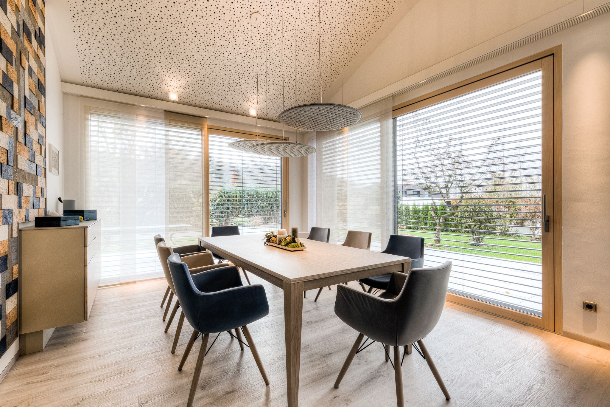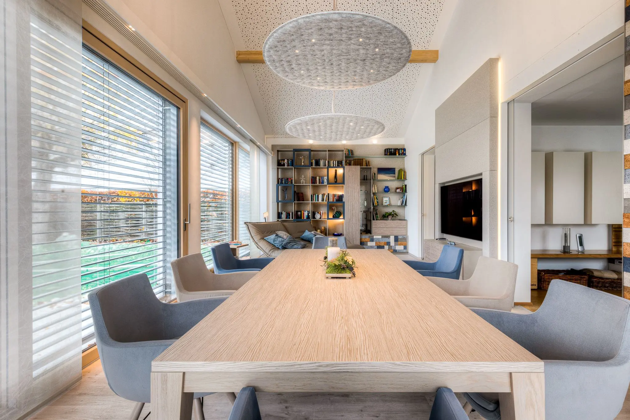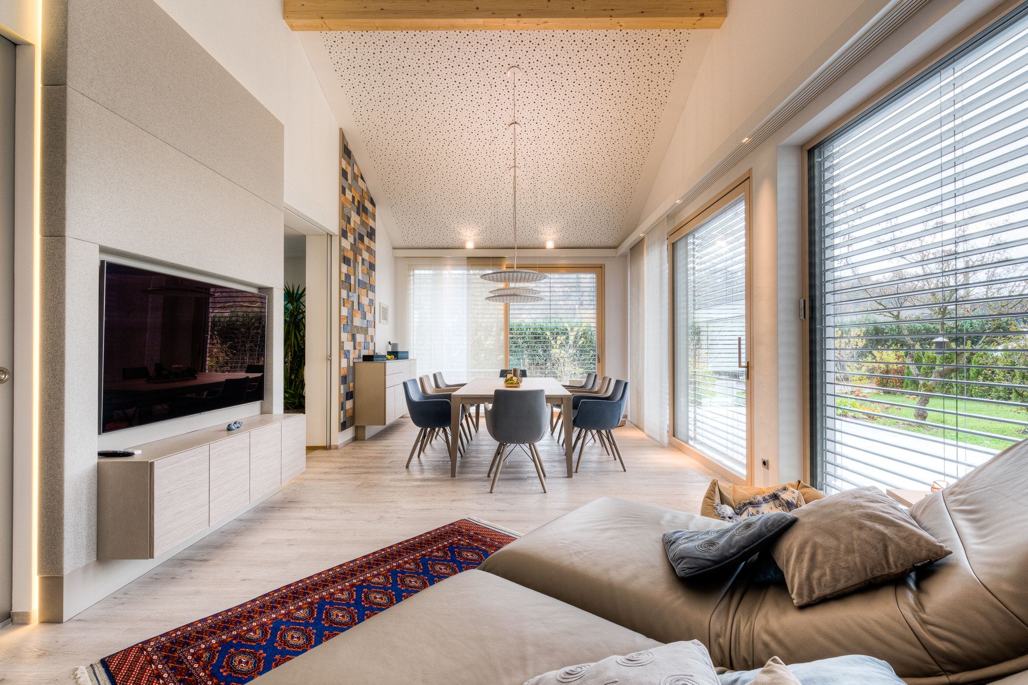 Durch die großen Glasflächen spielt automatisch die Akustik eine wichtige Rolle. Glatte Oberflächen und dazu die hohen Räume lassen den Schall von Stimmen oder Geräuschen länger im Raum reflektieren, verschlechtern so die Akustik und stören ein nettes Gespräch oder den Klang einer Stereoanlage maßgeblich. In unserem Projekt sehen Sie verschiedene Möglichkeiten, um dem entgegen zu wirken. Ein Großteil des Schalls wird über die Decke reflektiert. Deshalb haben wir für diesen sehr haushohen Raum eine spezielle Akustikdecke mit Lochmuster verwendet. Sie trägt stark zu einer angenehmen Raumakustik bei und sorgt gleichzeitig für ein interessantes Design. Hinter dem großen Bücherregal und rund um den Fernsehen sind Akustikplatten in Stoff verkleidet versteckt, um den glatten Wänden eine weichere, schallabsorbierende Note zu verpassen. Die bunte Wanddekoration aus Kork dient nicht nur als toller Hingucker, sondern ist auch ein echter Schall-Schlucker. Und auch die Tischleuchten sind in schallabsorbierendem Stoff verpackt, damit sich auch mehrere Leute am Tisch in Ruhe unterhalten können. Alles in allem sorgt für einen zusätzlichen Wohlfühlraum mit viel Funktion.