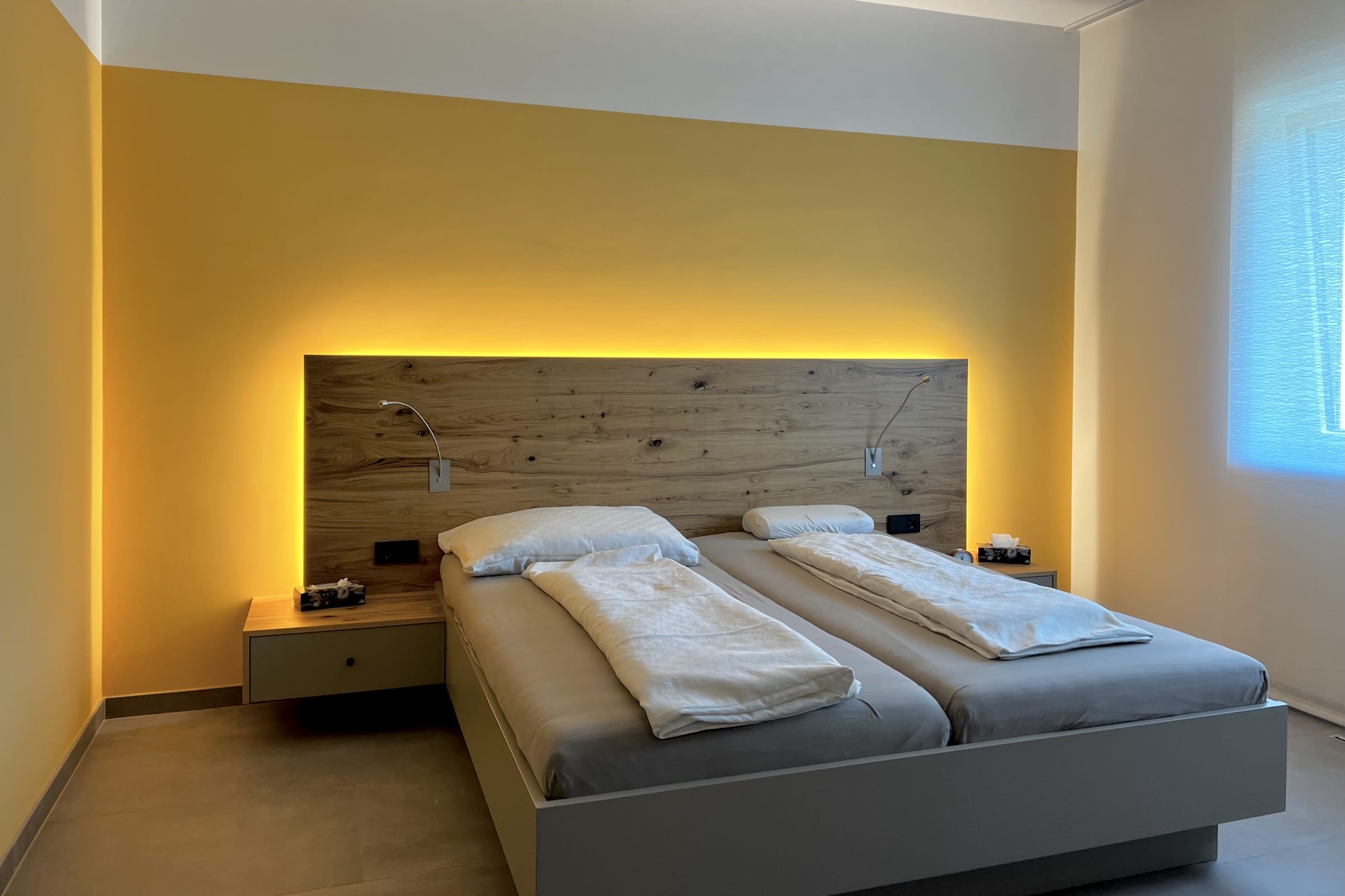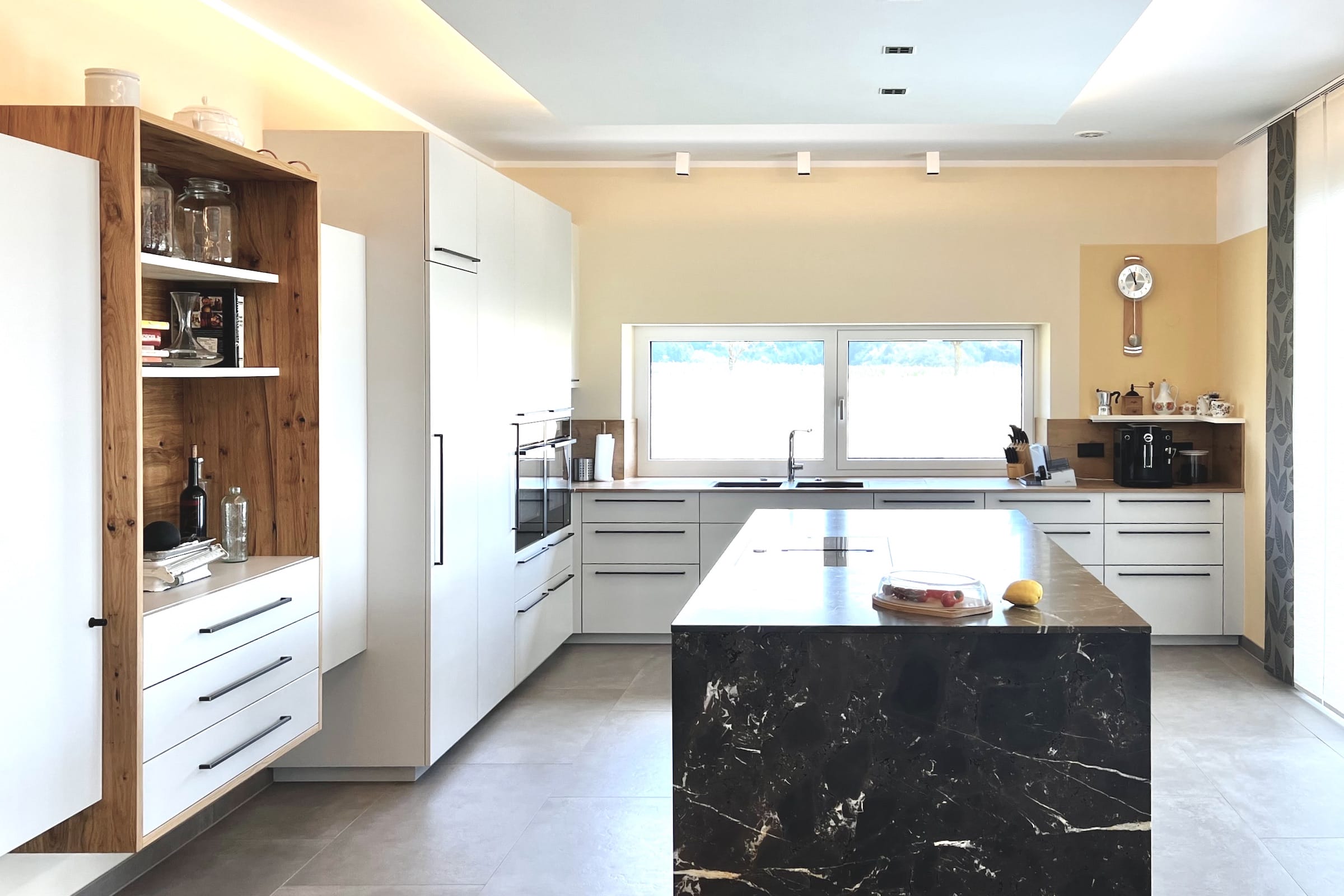 Wie gewünscht und ausgeplant, wurde ein harmonisches Zusammenspiel von Materialien und Farben für den Kunden im gesamten Innenbereich umgesetzt. Von der Beleuchtung über Wandfarbe und Bodenfliesen bis hin zu den maßgefertigten Möbeln, alles erfüllte eine Funktion und bekam seinen angestimmten Platz. Auch eine abgehängte Akustikdecke über dem Esstisch und jede Menge indirekte Beleuchtungslösungen durften natürlich nicht fehlen. Sie sind tragender Bestandteil eines gemütlichen Zuhauses.