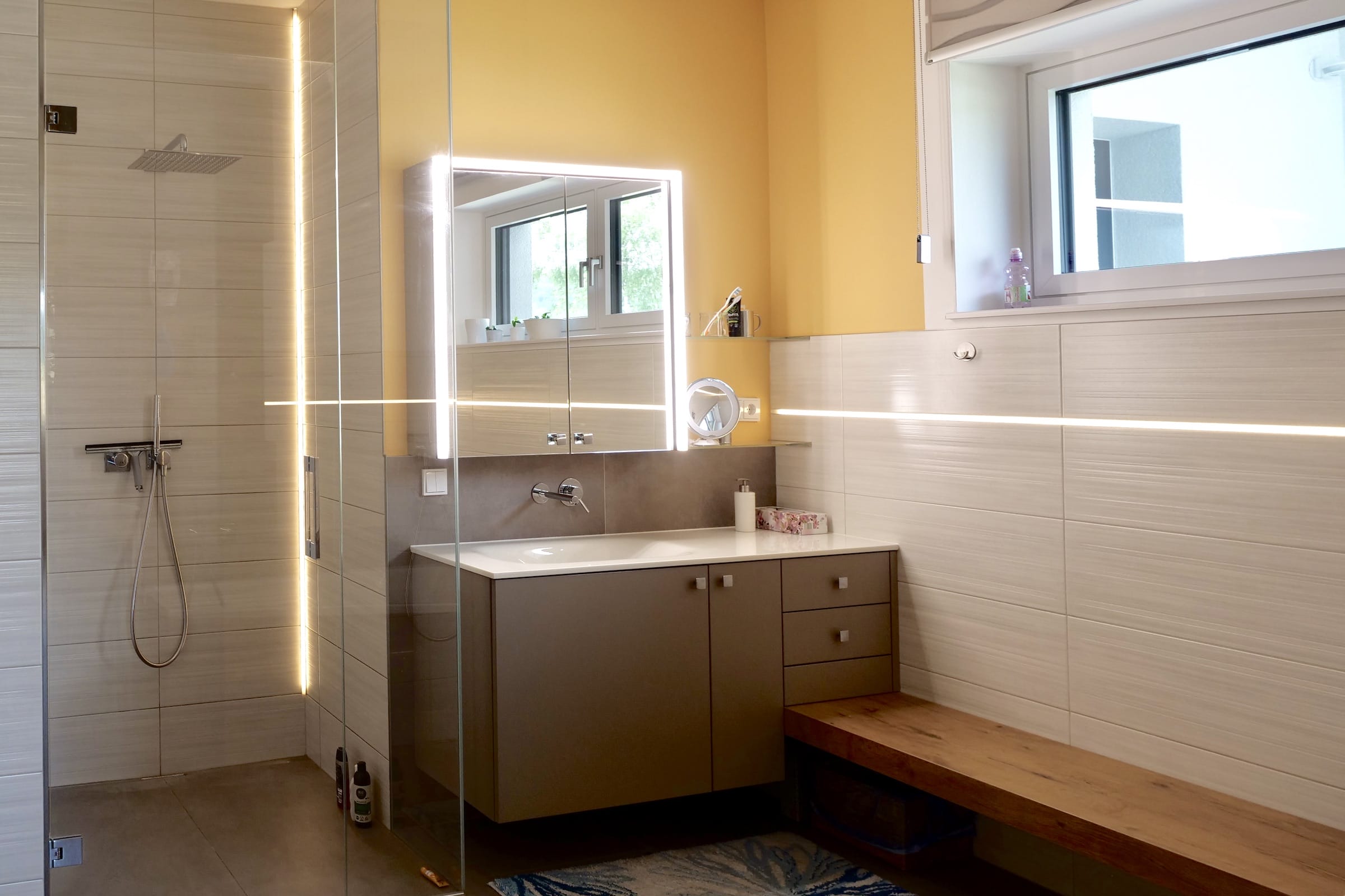 Das Bad ist so geräumig, dass man sich zu Zweit problemlos darin bewegen kann. Es gibt keinerlei Bodenunebenheiten, alles ist komplett barrierefrei konzipiert. Eine zwischen Badewanne und Waschbecken eingebaute Sitzbank garantiert zusätzliche Bequemlichkeit. Pflegeleicht, hell und komfortabel gestalten sich beide Räume, in denen sich unsere Kunden (und Gäste) sehr wohl fühlen.