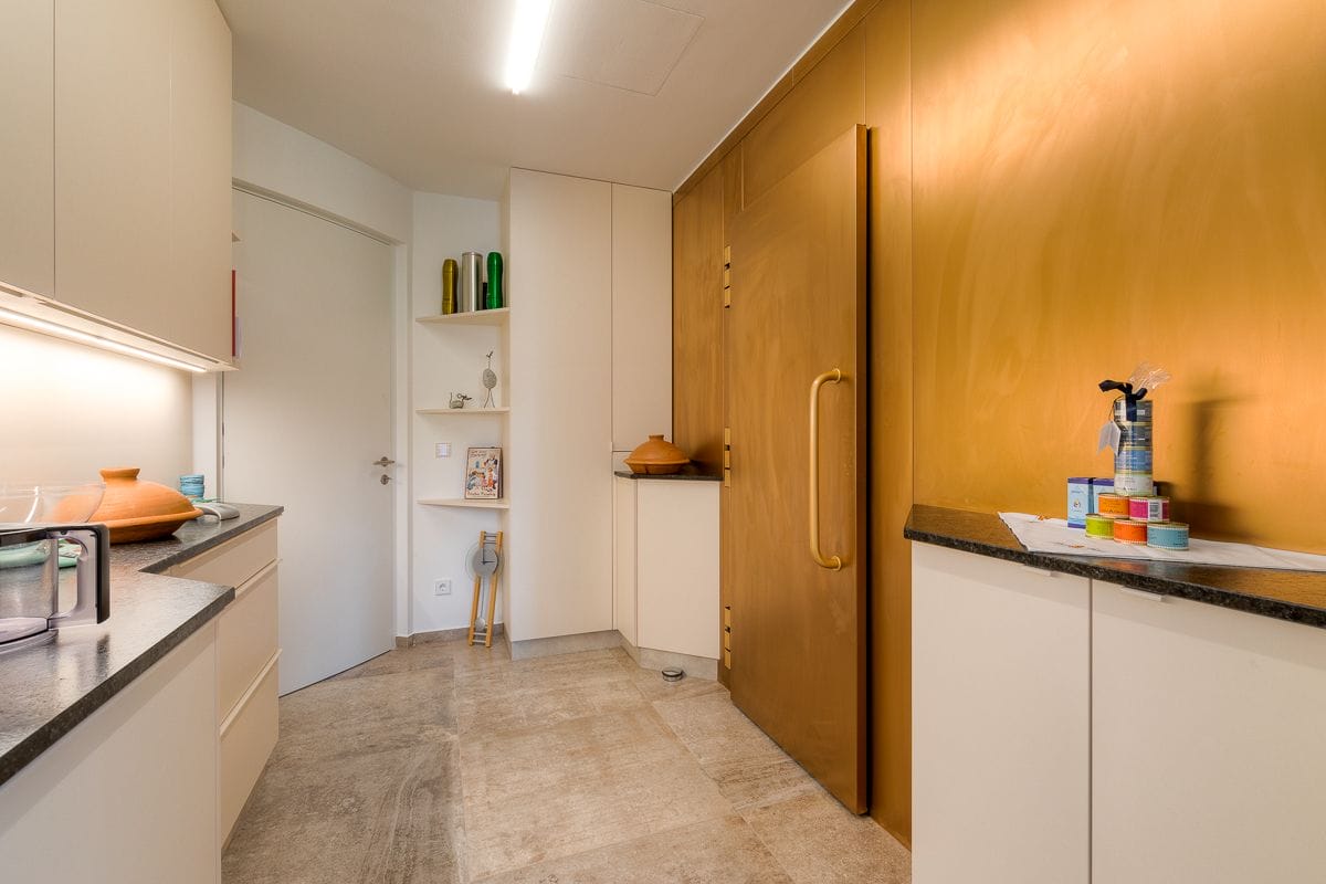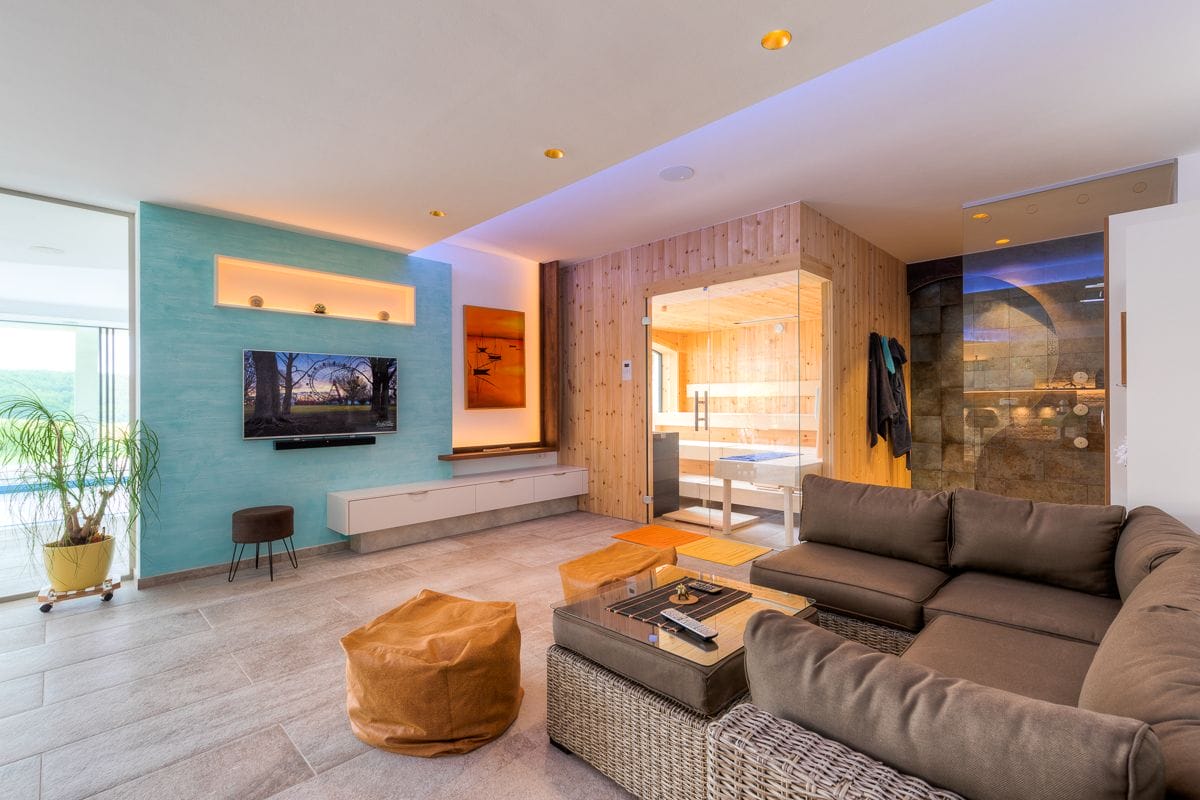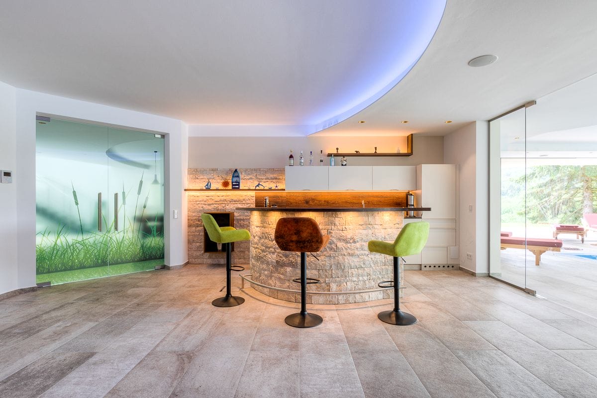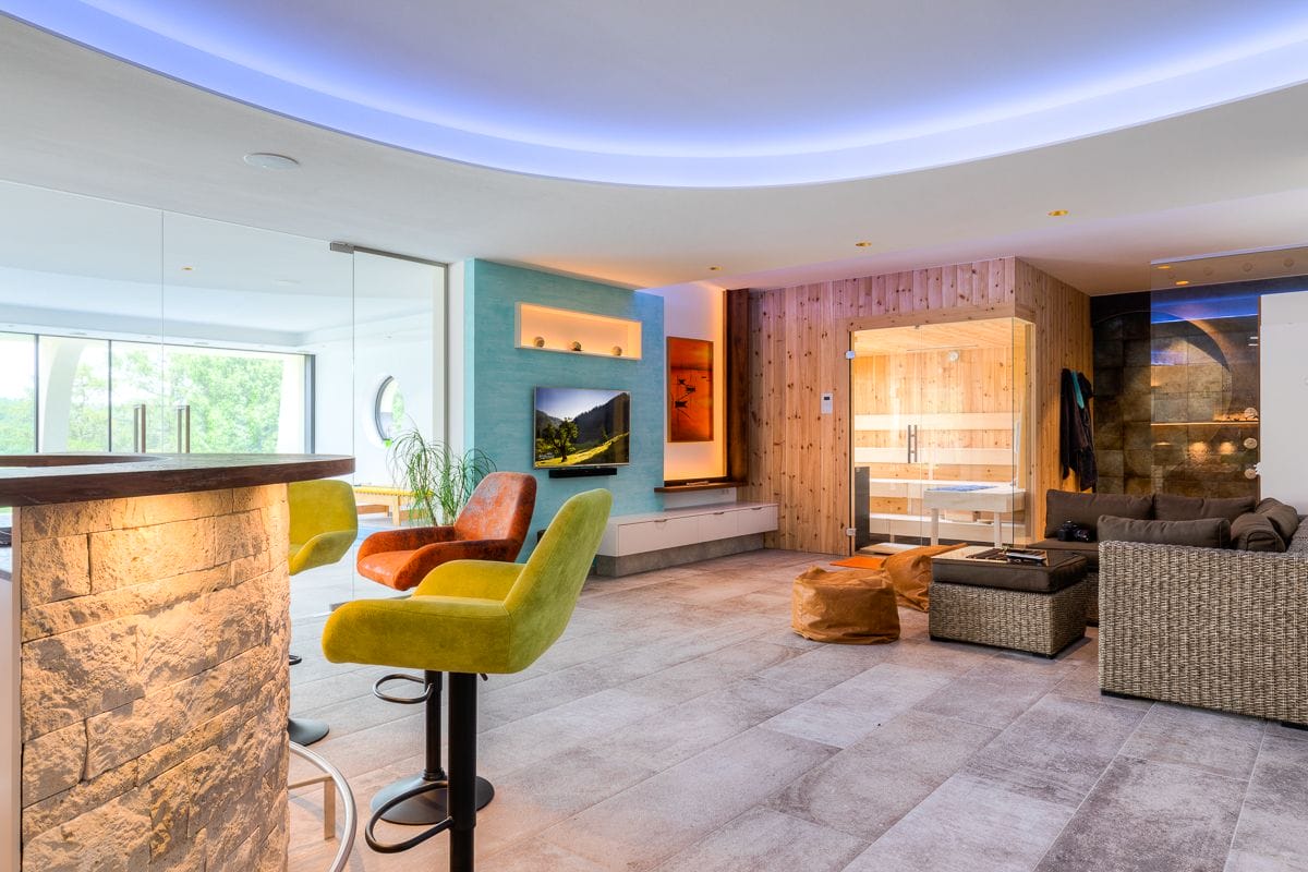 Passend zur gewählten Feinstein-Antikfliese entschieden wir uns für eine Crackeiche kombiniert mit einer gedämpften Prägeeiche für das Mobiliar. Beide verleihen dem Haus eine warme Atmosphäre. In der Küche sowie in der Bar des Wellnessbereichs verwendeten wir dazu unifarbene Hochglanzfronten und einen dunklen, gelederten Naturstein für die Arbeitsplatten. Dazu kommen im Wellnessbereich noch Kalkwandsteine in naturbelassener Oberfläche. Alle färbigen Wandpartien im Vorraum, dem Barbereich, im Badezimmer, dem WC und dem Wellnessbereich wurden in speziell ausgeführter Spachteltechnik gestrichen. Dies sorgt für diese besondere Maserung in der färbigen Oberfläche.