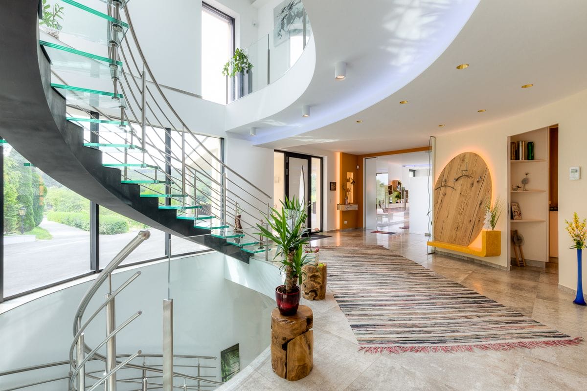 Beginnen wir mit dem großzügigen Eingangsbereich und seiner eindrucksvollen Glasstiege. Dies war unser Startpunkt bei dem wir mit der Gestaltung ansetzten. Viel Glas lässt einen Raum automatisch kühler wirken. Deshalb war unsere Aufgabe dem entgegenzuwirken und mehr Wärme und Gemütlichkeit in den Vorraum zu bringen. Warme Materialien und Farben mussten also her. Wie immer begannen wir bei der Materialauswahl mit dem Langlebigsten: dem Boden. Hier griffen wir zu einer Feinstein Antikfliese in leicht polierter Optik. Diese ist sehr unempfindlich, passt gut zur modernen Bauweise des Hauses und erlaubt alle Richtungen bei der weiteren Einrichtung. Außerdem bringt sie durch den Antikcharakter eine gewisse Wärme mit. Der Boden wurde dann auch durch alle Räume – sogar bis auf die Terrasse im Außenbereich, dafür allerdings in matt gebürsteter Oberfläche – gezogen, um aus dem quadratmeterreichen Haus eine Einheit zu schaffen. In Abstimmung mit den Farb- und Materialvorlieben unseres Kunden, entschieden wir uns in weiterer Folge für eine Crackeiche für die Möbel in Kombination mit sonnigen Farbtönen.