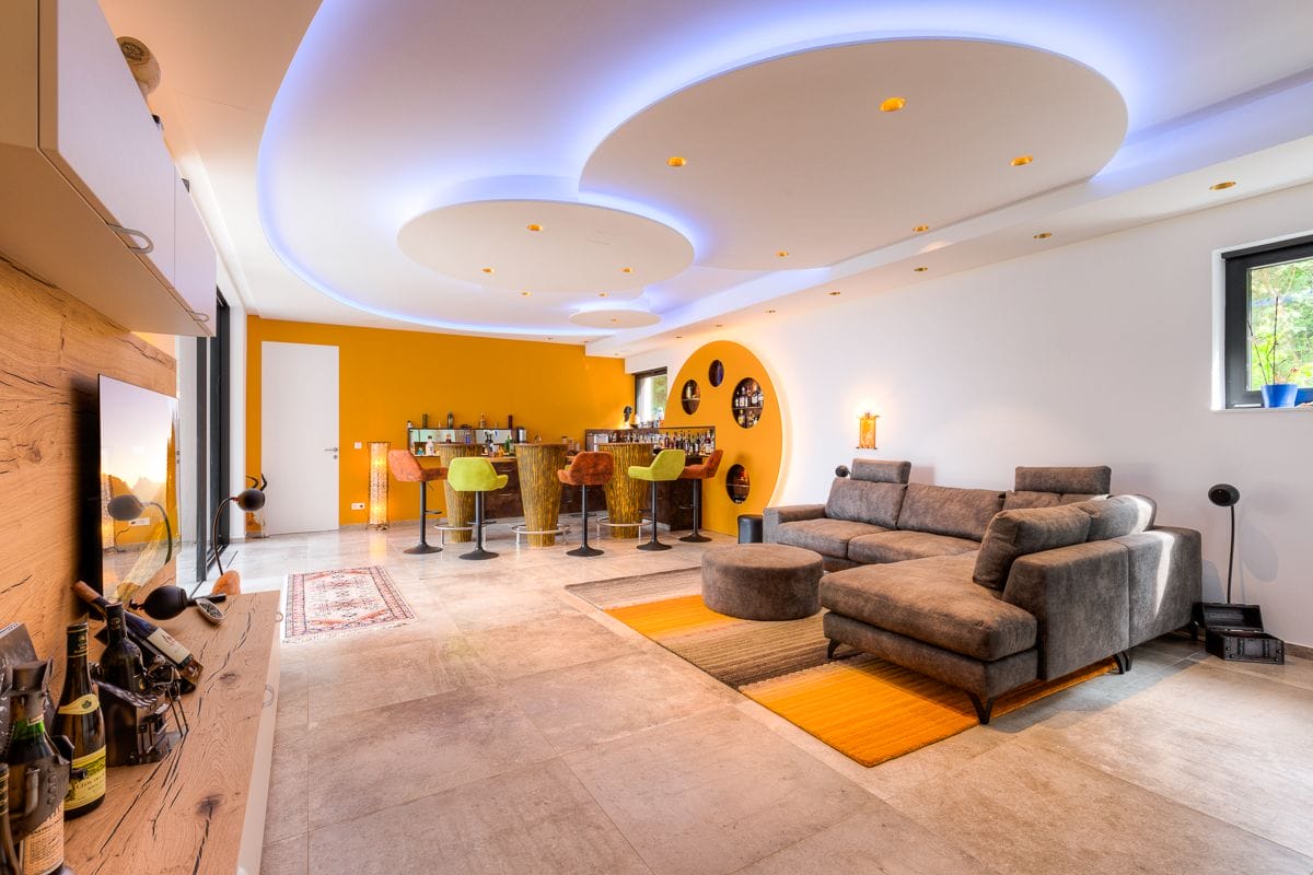 Ein weiterer wesentlicher Punkt, um die Rundung der Glasstiege und der dahinterliegenden Außenwand zu unterstützen, ist die Beleuchtung. Die Spots an der Decke sowie die indirekte Beleuchtung unterstreichen die Formgebung, damit diese noch besser hervor kommt. Das RGB Licht der indirekten Beleuchtung sorgt für zusätzliche Wärme und die Möglichkeit verschiedene Lichtstimmungen zu erzeugen. Gleichzeitig untermalt die Deckengestaltung die Rundung der Stiege sowie der Außenmauer. Dies bringt uns auch gleich zum nächsten spannenden Punkt.