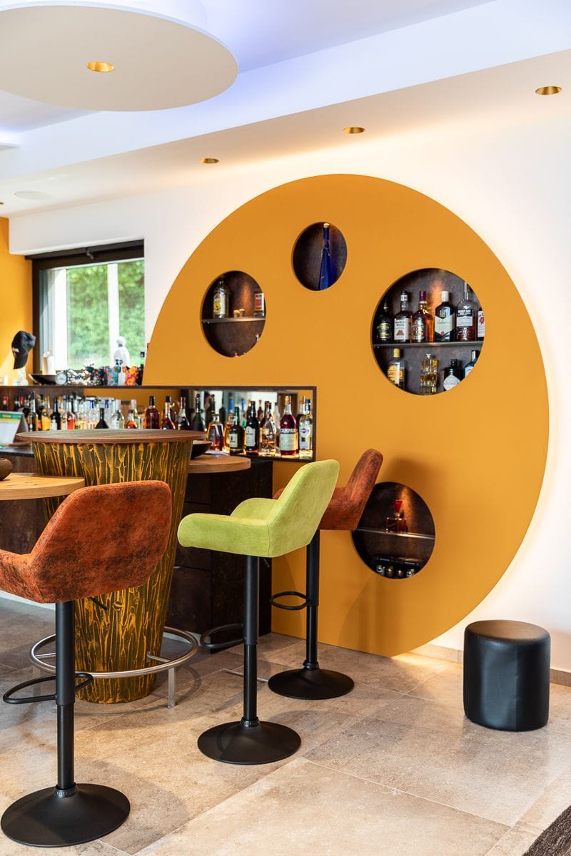 Ein ganz besonderes Unikat, welches wir gerne hervorheben möchten, ist die Bar im Eingangsbereich. Speziell von uns für unseren Kunden designed und angefertigt ist diese Bar, im Vergleich zu klassischen Stehbars, ein echter Hingucker. Die kegelförmigen Stehpulte wurden passend zur Decke ellipsenförmig angeordnet und mit Massivholzplatten verbunden. Die besondere Spachteltechnik kam auch hier zum Einsatz und sorgt für eine einzigartige Maserung und sehr spannende Optik. Die besondere Form spiegelt die Vorlieben für Rundungen unseres Kunden wider.