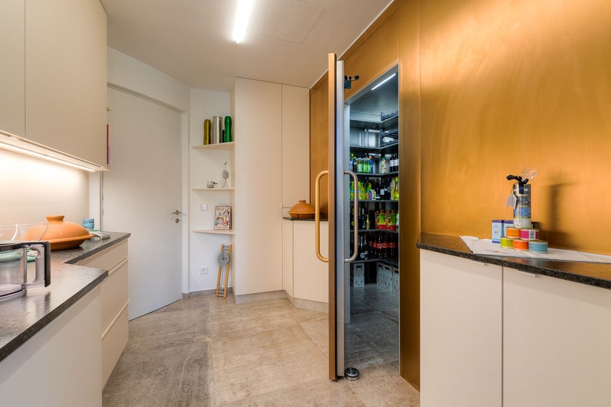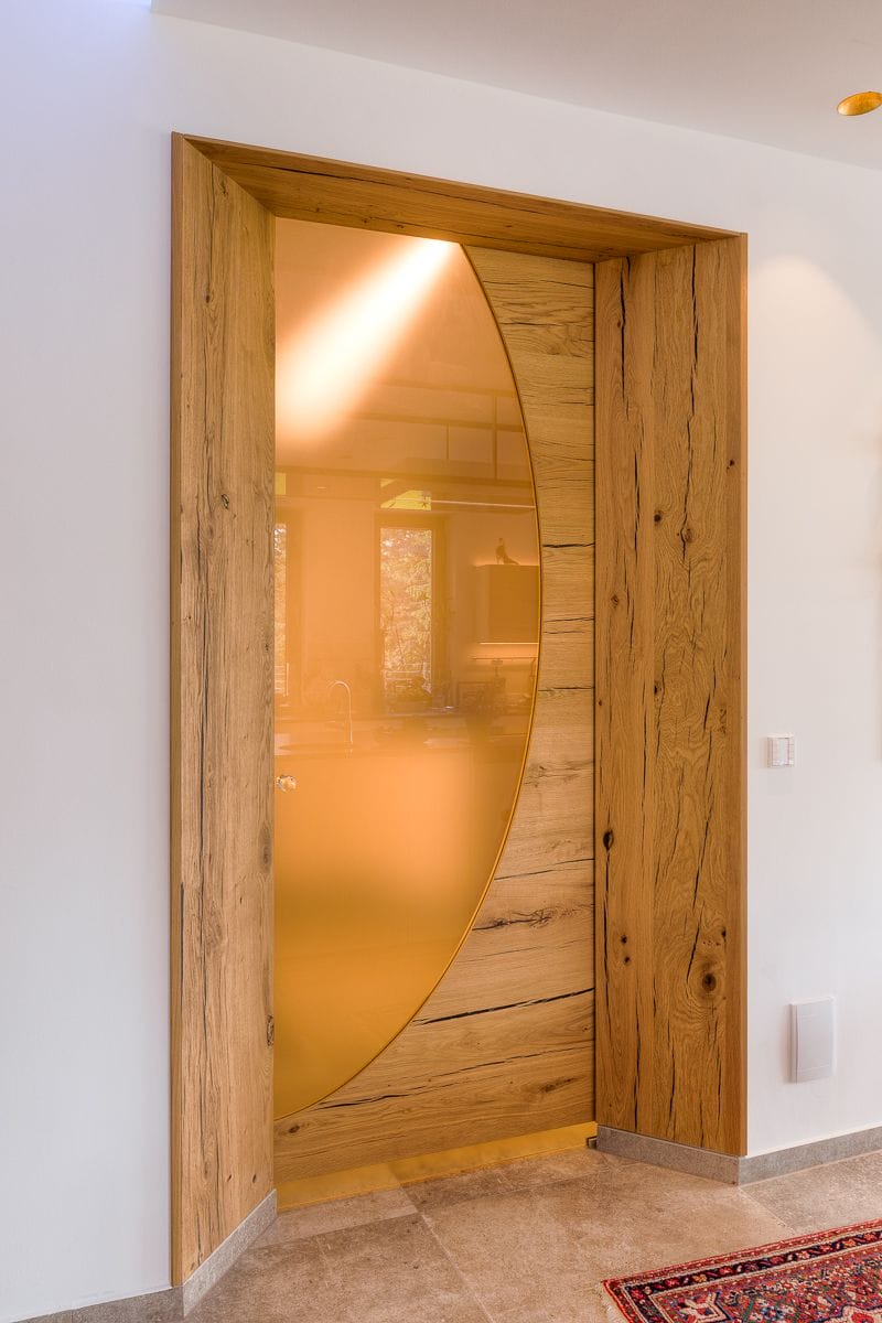 Ein kleines und doch besonderes Detail sind die Türen im Küchenbereich. Die eine stellt die Verbindung zum Nebenraum der Küche – ausgestattet mit einem Kühlraum in Kupferoptik, einem Geschirrspüler und einer weiteren Möglichkeit zum Anrichten – her. Die andere führt in den Barbereich. Die Türen aus Holz in Verbindung mit Glas in derselben Ellipsenform der Decke und der Bar sind für uns das Tüpfelchen auf dem I.