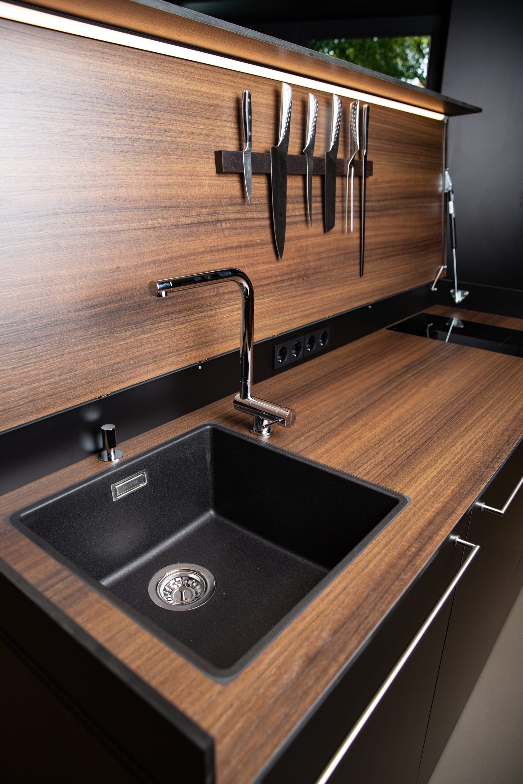 Fließendes Wasser darf natürlich in keiner Küche fehlen. Das flächenbündige Spülbecken mit versenkbarer Armatur bietet ausreichend Platz um alles sauber zu halten. Zusätzlich finden Sie unter der Spüle einen ausklappbaren Abfallbehälter praktisch integriert.