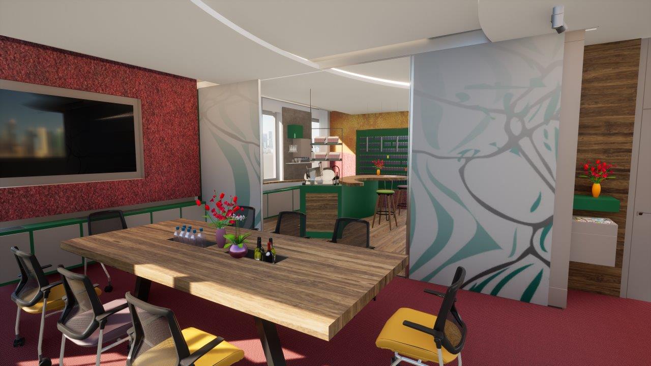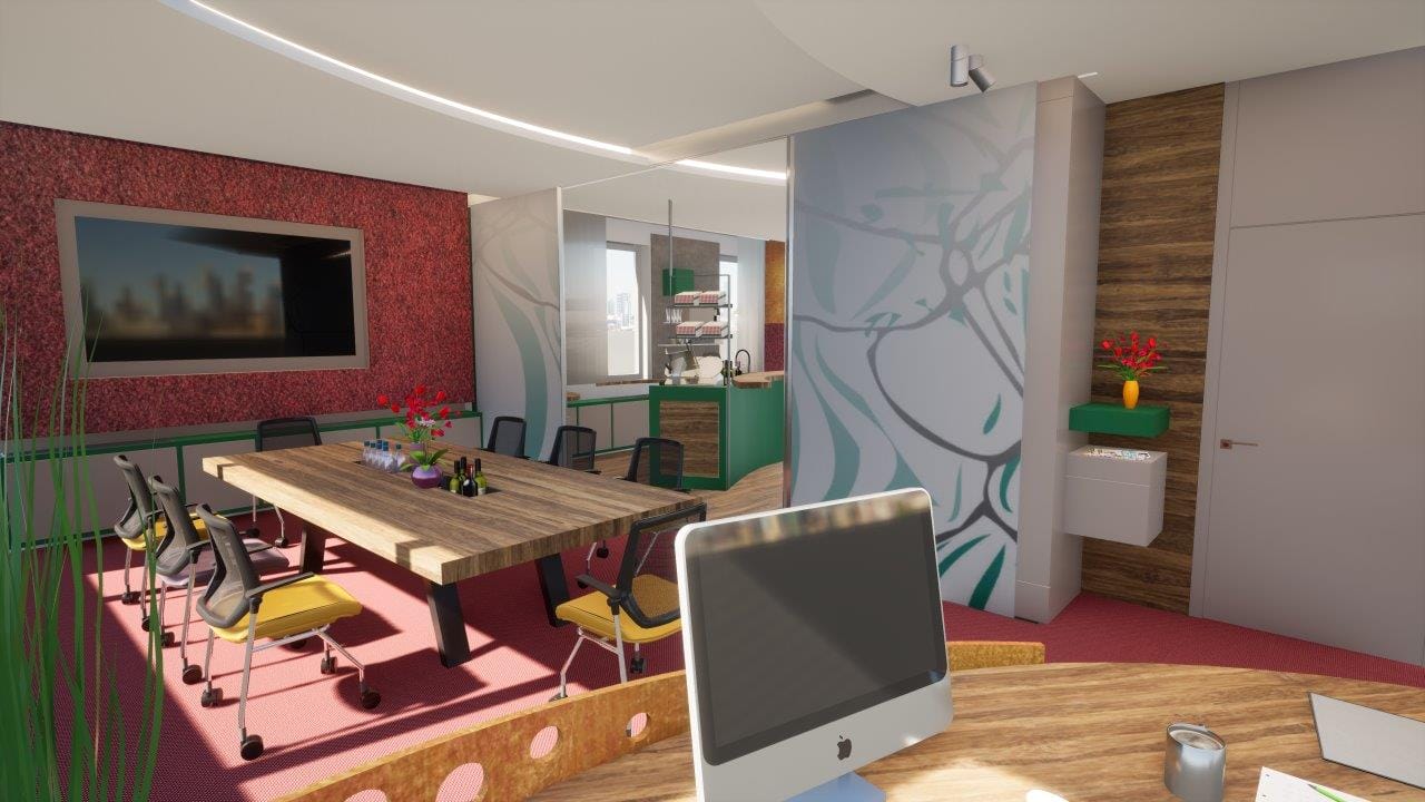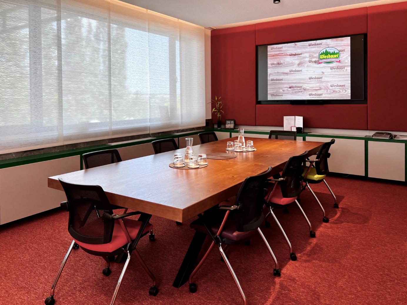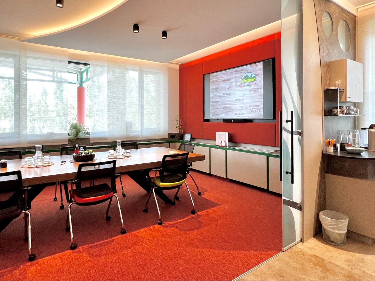 Besprechungen benötigen heutzutage in der Regel computergestützte Software und entsprechende Bildschirme, um Bilder, Videos und Dokumente für alle sichtbar zu machen. Für den Geschäftsführer haben wir deshalb an der hinteren Wand einen großen Bildschirm positioniert, um wirklich jedem Teilnehmer eine ideale Sicht zu bieten. Die Wand dahinter ist mit speziellem, schallabsorbierendem Stoff bespannt, um die Akustik bei Besprechungen optimal zu unterstützen.