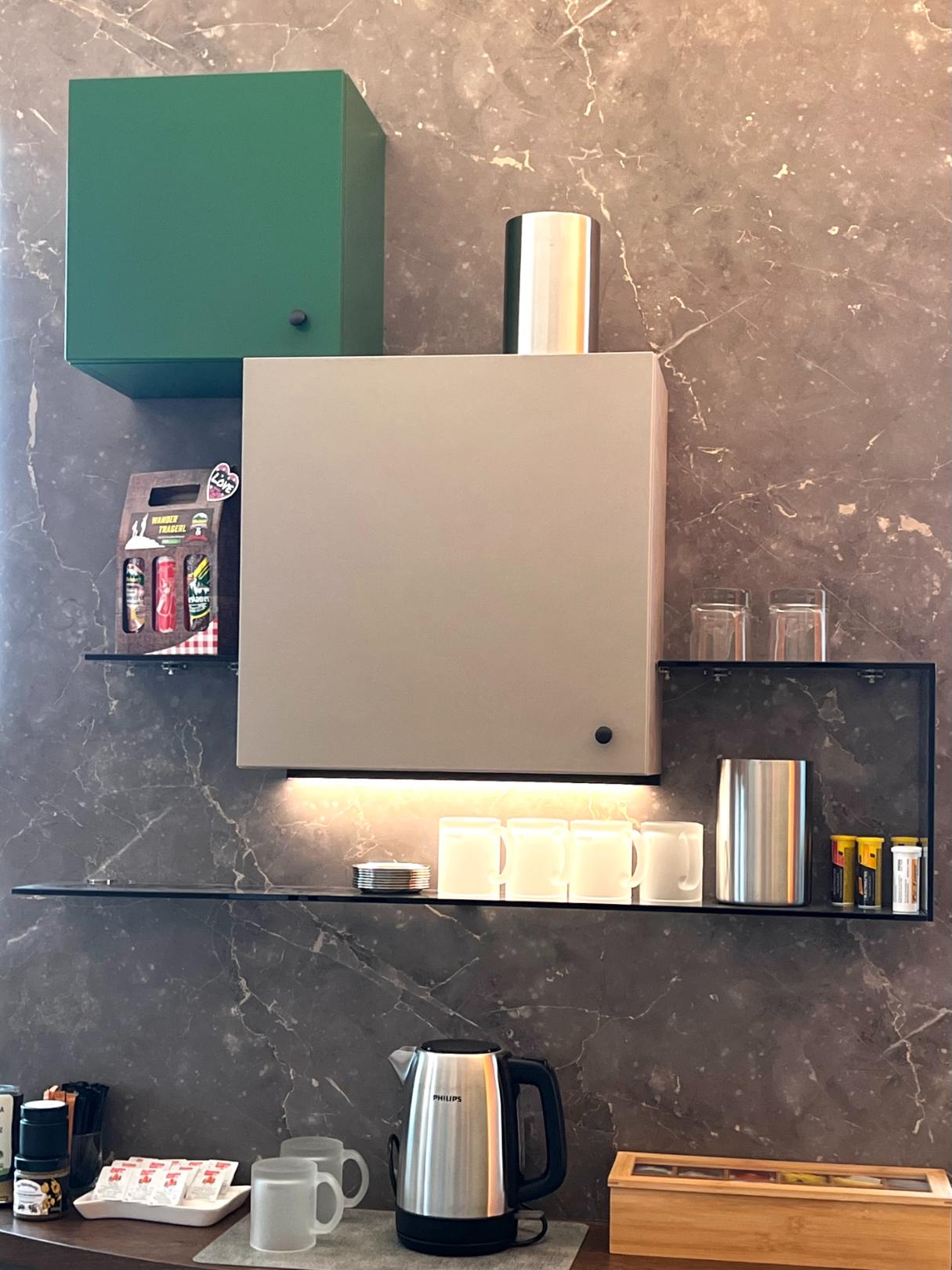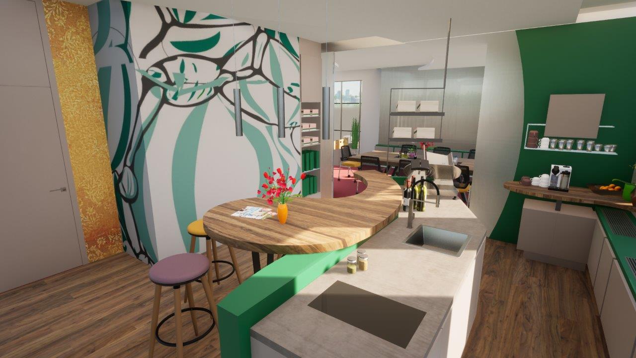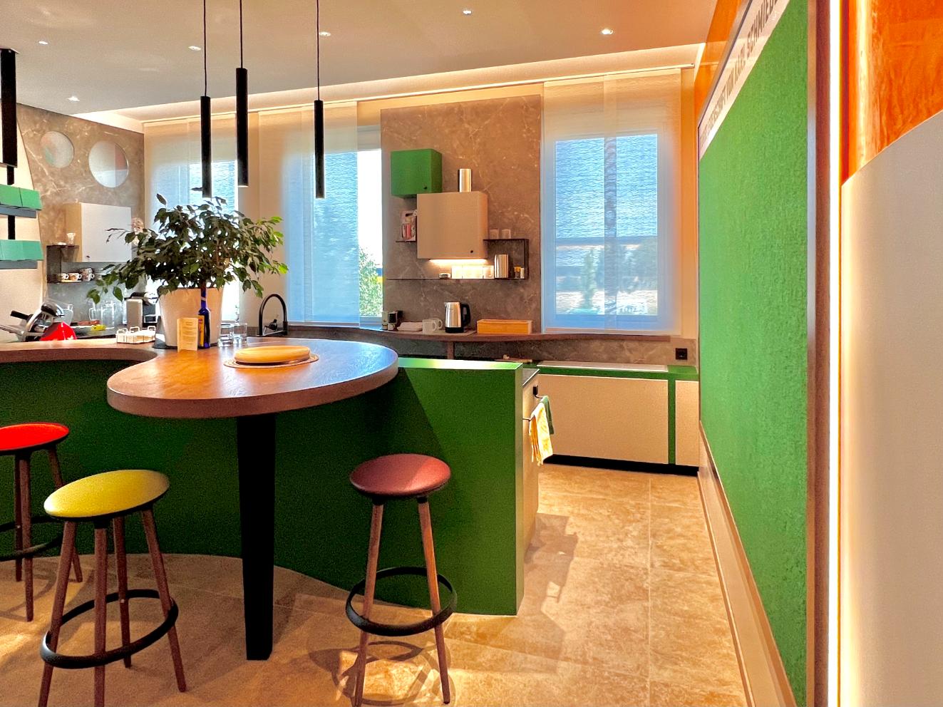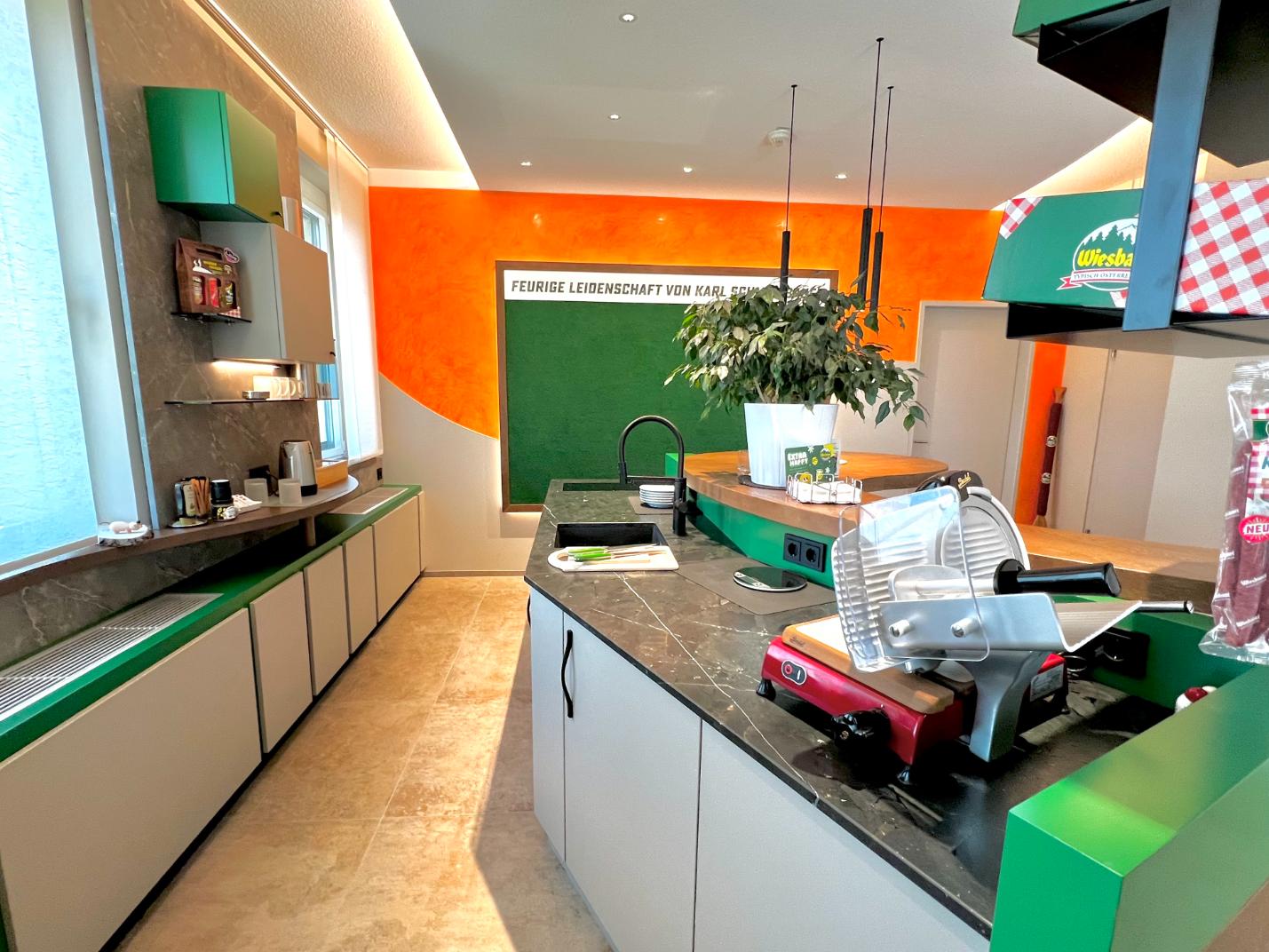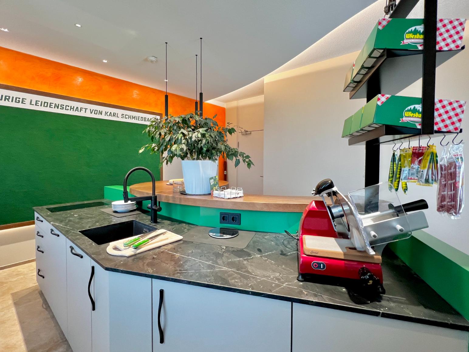 Mit einer geschwungenen Barplatte konnte ein zusätzlicher Besprechungstisch bzw. Feierbereich geschaffen werden, während die Ausstattung mit Spülbecken, Geschirrspüler, Ceranfeld, Kaffeemaschine, Schneidemaschine, zwei Kühlschränken und reichlich Stauraum ein gemütliches Beisammensein ermöglicht. Auch hier wurde mit Farben nicht gegeizt!