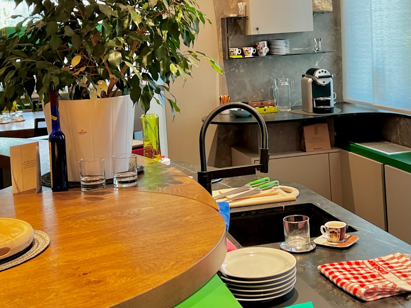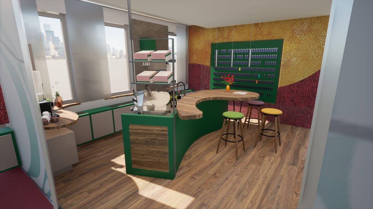 Dieser Raum wurde besonders einladend gestaltet, um neue Produkte präsentieren, testen und verkosten zu können. Farben, Materialien und Möbel sind harmonisch aufeinander abgestimmt.