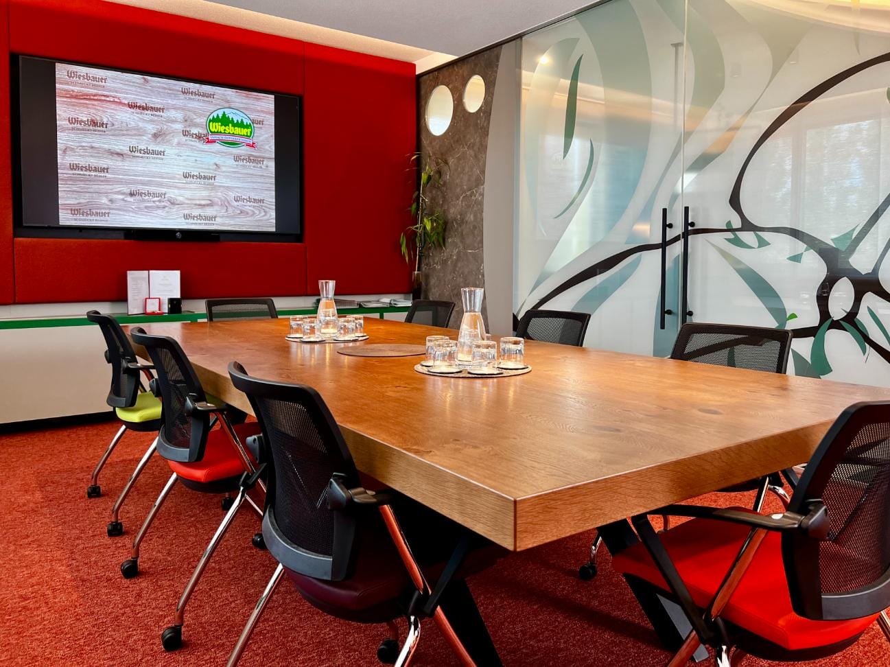 Herr Schmiedbauer wollte sich in seinem neuen Büro rundum wohlfühlen. Daher war es uns wichtig, die Identität der Firma Wiesbauer GmbH auch im Innenraum widerzuspiegeln – angefangen bei den Firmenfarben bis hin zum Branding. Sein Wunsch nach einer individuellen Wohlfühlatmosphäre führte zu der Idee eines persönlichen „Firmenwohnzimmers“. Der gewählte Planungsstil zeichnet sich durch eine moderne Ästhetik aus, die jedoch keineswegs kühl und schlicht, sondern vielmehr warm, einladend und leicht organisch wirkt – passend zum Gesamtauftritt des Unternehmens.