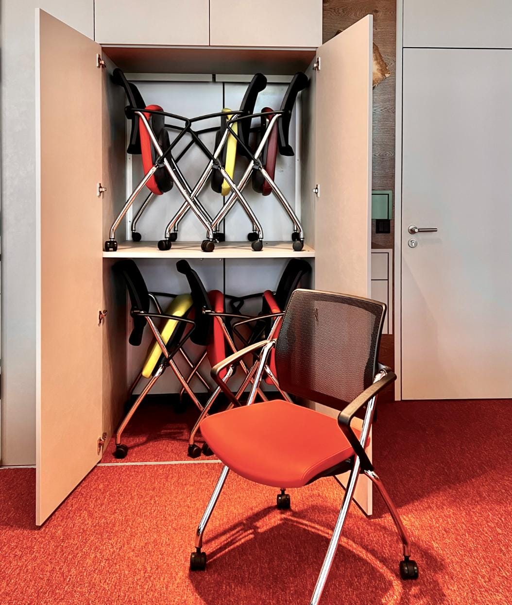 Der massiv wirkende Besprechungstisch strahlt Robustheit aus und wirkt dennoch durch seine Holzoberfläche warm und gemütlich. Er bietet Platz für bis zu 14 Personen, wobei normalerweise 8 Sitzplätze dauerhaft vorgesehen sind. Zusätzlich können bis zu 6 weitere Sitzplätze bei Bedarf hinzugefügt werden, die in den Stauraumelementen an der Wand untergebracht sind – jederzeit griffbereit und dennoch unsichtbar (siehe Video am Ende des Artikels).