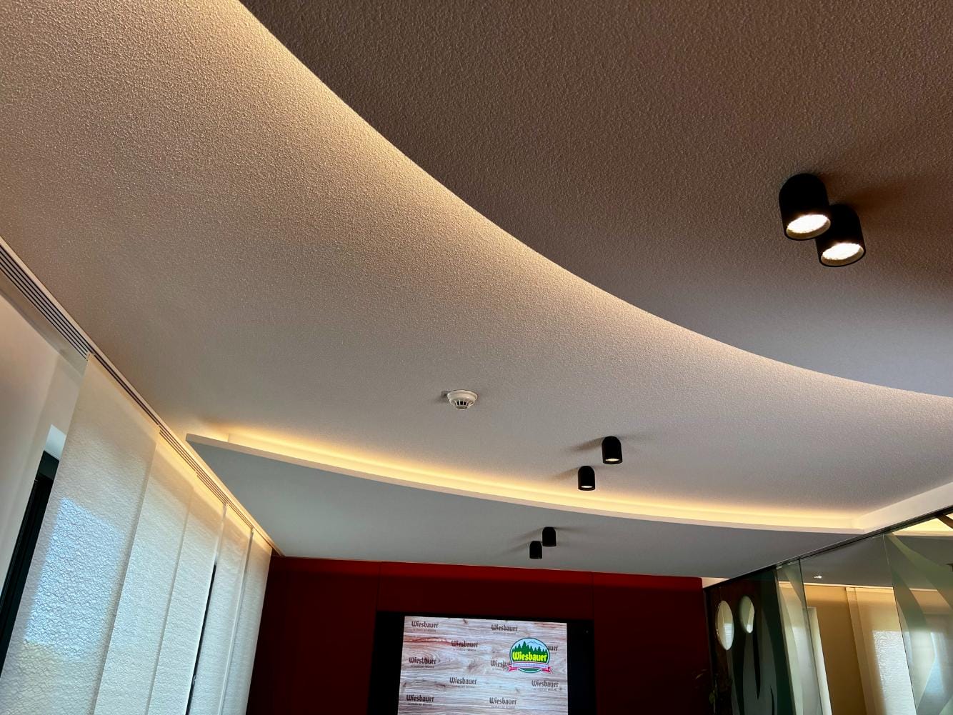 Wirklich extravagant ist das für Herrn Schmiedbauer konzipierte Beleuchtungskonzept, das in die Deckengestaltung mit eingeflossen ist. In den Fotos sieht man deutlich, wie die unterschiedlich abgehängten Decken- und Wandelemente mit den direkten und indirekten Beleuchtungslösungen zusammenspielen. Alles dient dazu, eine angenehme Raumatmosphäre zu schaffen, was sowohl den Geräuschpegel bei Besprechungen als auch die Lichtverhältnisse betrifft.