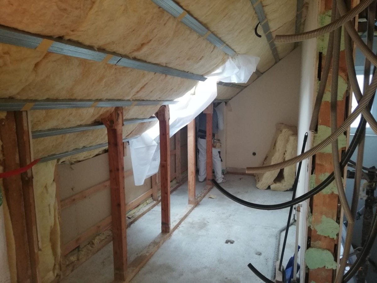 Unter Berücksichtigung aller Wünsche unserer Kunden und einer genauen Prüfung der Gegebenheiten hat sich unsere Projektleiterin Sandra an die Planung gemacht. Wände, Decken, Fliesen und Parkett wurden komplett entfernt. Bautechnische Unzulänglichkeiten bei der Dämmung des Daches korrigiert, der Estrich teilweise erneuert, und neue Rigipsdecken und Wände an den richtigen Stellen eingezogen. Damit wurde der Dachboden lückenlos neu auf- und ausgebaut, und für das neue Wohlfühlkonzept deutlich mehr Raum geschaffen. Stichwort: Hotelfeeling!