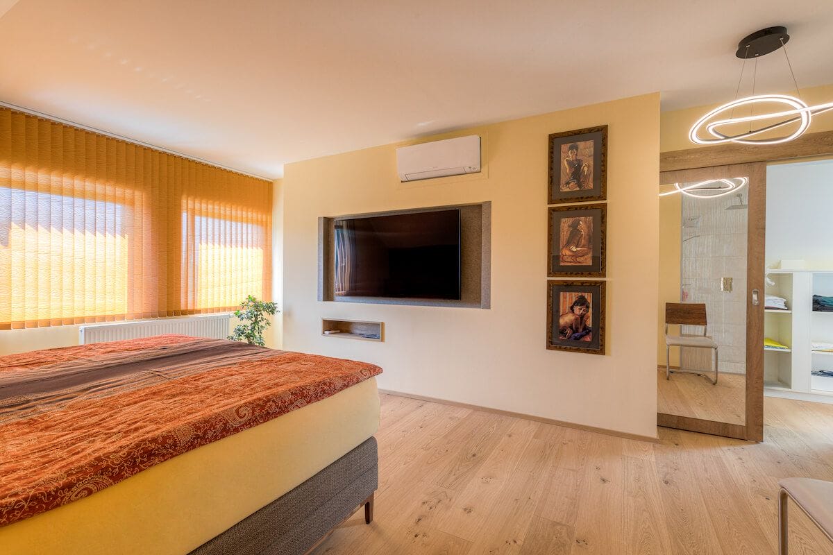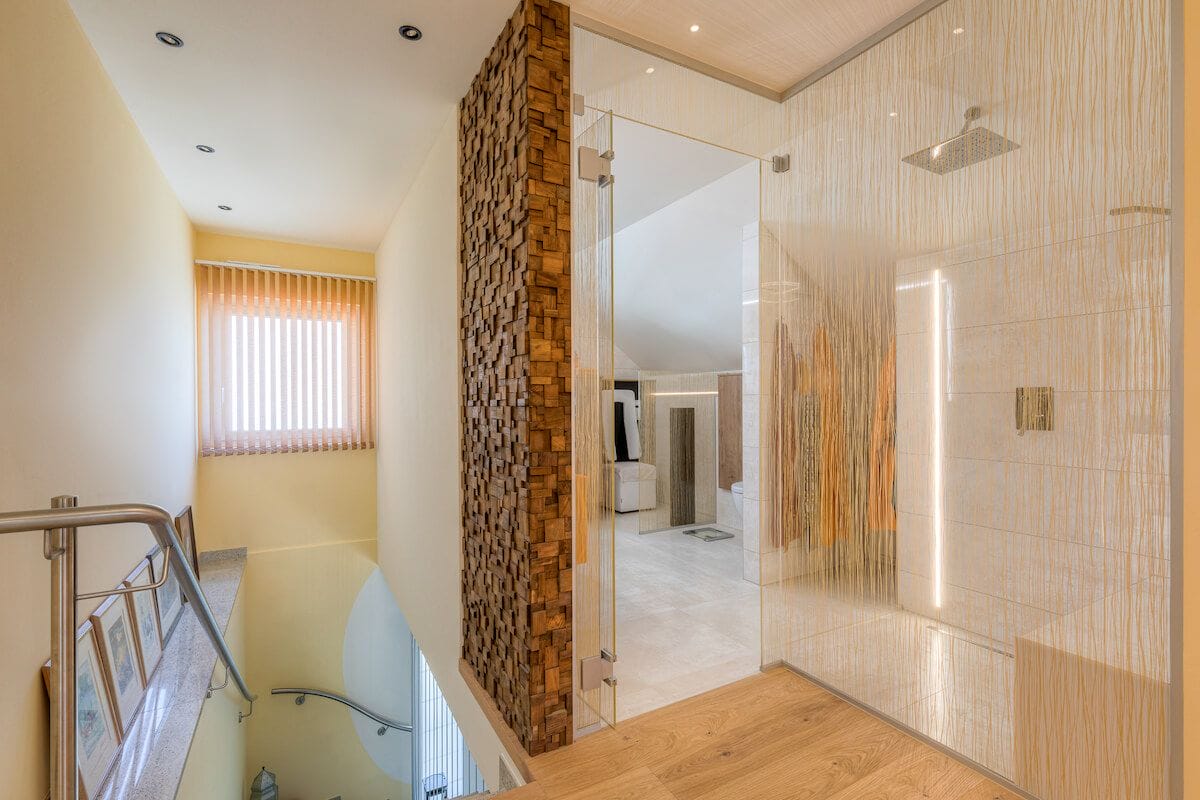 Während der Stiegenaufgang überwiegend so belassen wurde, wie er war (außer dass wir Strahler eingebaut und den Bereich ausgemalt haben), wurde das Bad komplett überholt und offen gestaltet. Hier kommt das vom Kunden gewünschte Hotelfeeling am meisten zum Tragen.