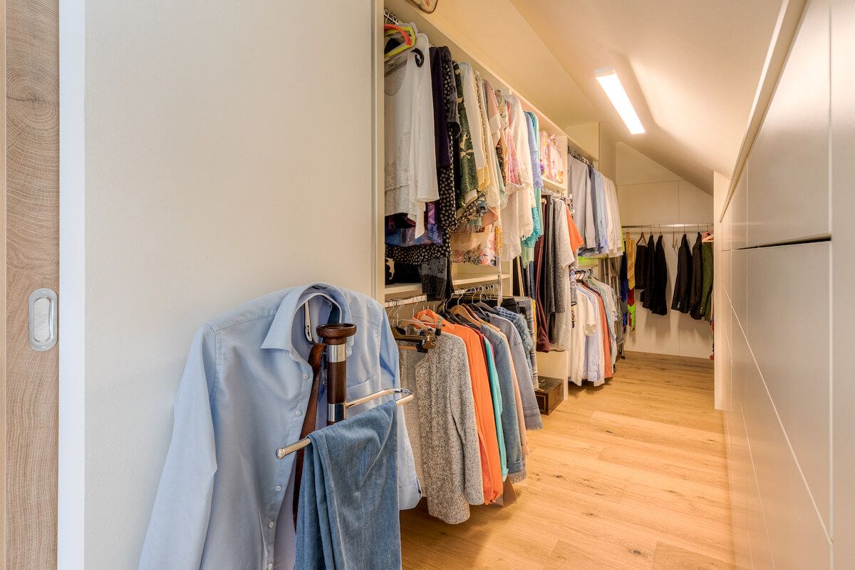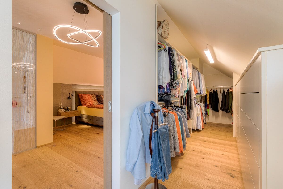 Der neu geschaffene Schrankraum hat jetzt zwar kein Fenster mehr, ist aber mit genügend Lichtquellen ausgestattet, wodurch dies überhaupt nicht ins Gewicht fällt. Der Raum erstreckt sich über die gesamte rechte Seite des Daches und wird durch eine große Spiegelglas-Schiebetür, die in der Zwischenwand nahtlos verschwindet, vom Schlafzimmer abgetrennt. (Hinter dem Fotografen geht der Raum noch weiter, leider aber ohne „Fotobeweis“ 😉