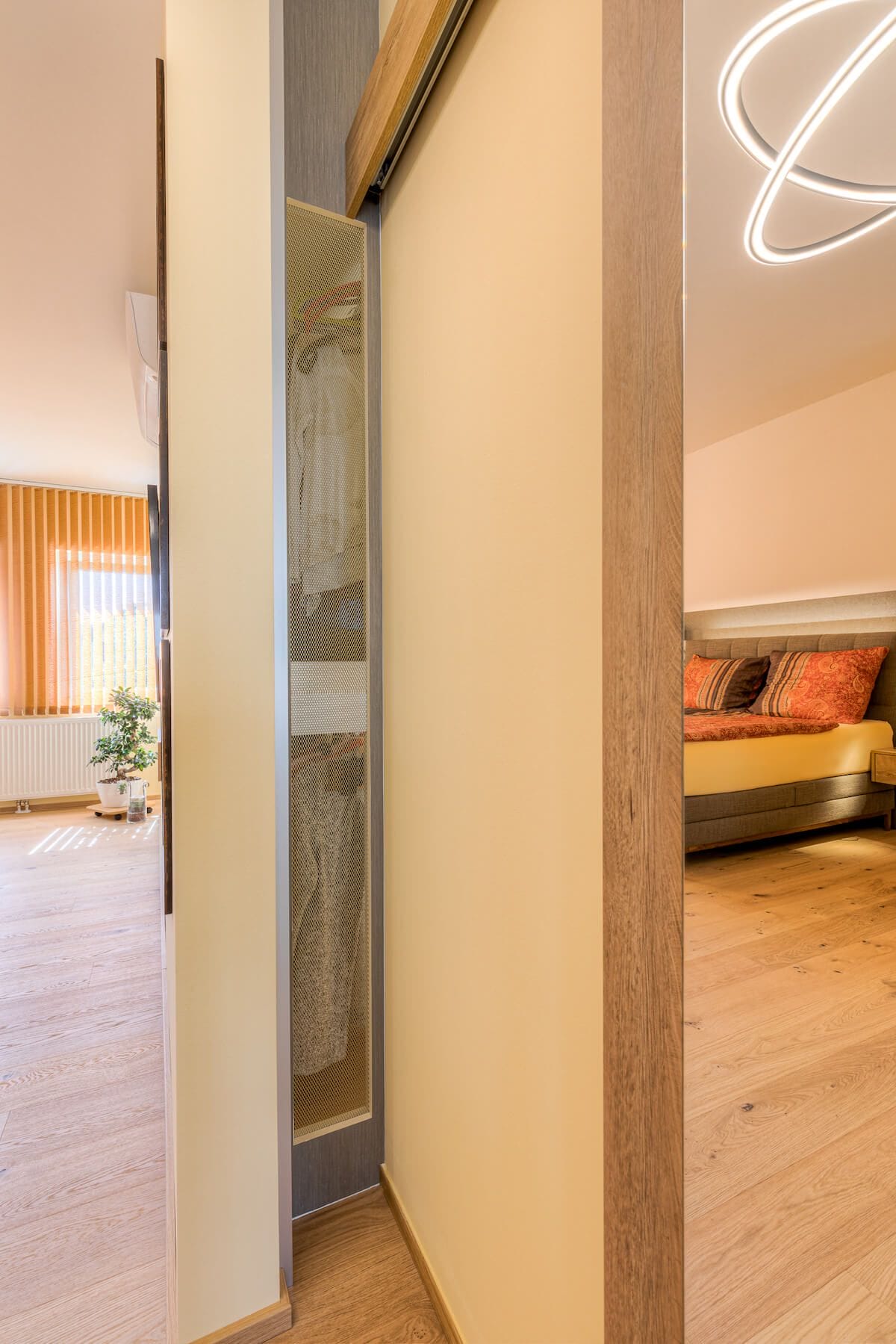 Das Schlafzimmer hatte vor dem Ausbau nur ein einziges Fenster. Der Raum sollte aber richtig viel natürliches Licht bekommen und deshalb konnte durch das Versetzen der Zwischenwand ein zweites Fenster vom ehemaligen Büroraum mit eingebunden werden. Um nun beim Öffnen dieses Fensters ausreichend Platz zu haben, wurde die Wand zur Fensterseite hin verkürzt. Als Wandabschluss ist auf beiden Seiten ein Lüftungsgitter aus Streckmetall mit Gold für eine gute Luftzirkulation im begehbaren Kleiderschrank verbaut worden. (Siehe Foto)