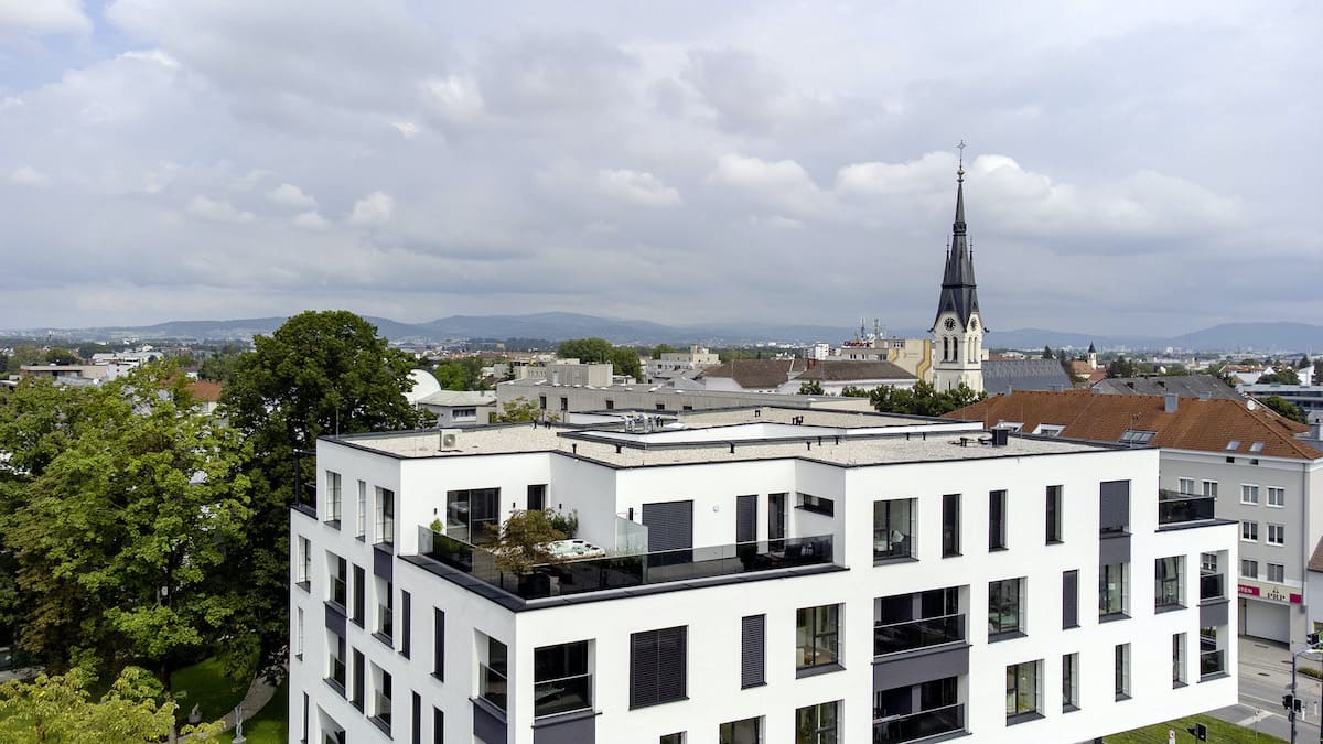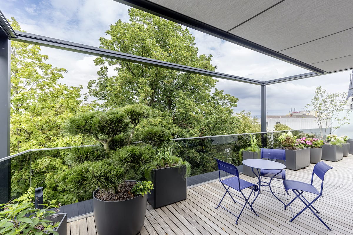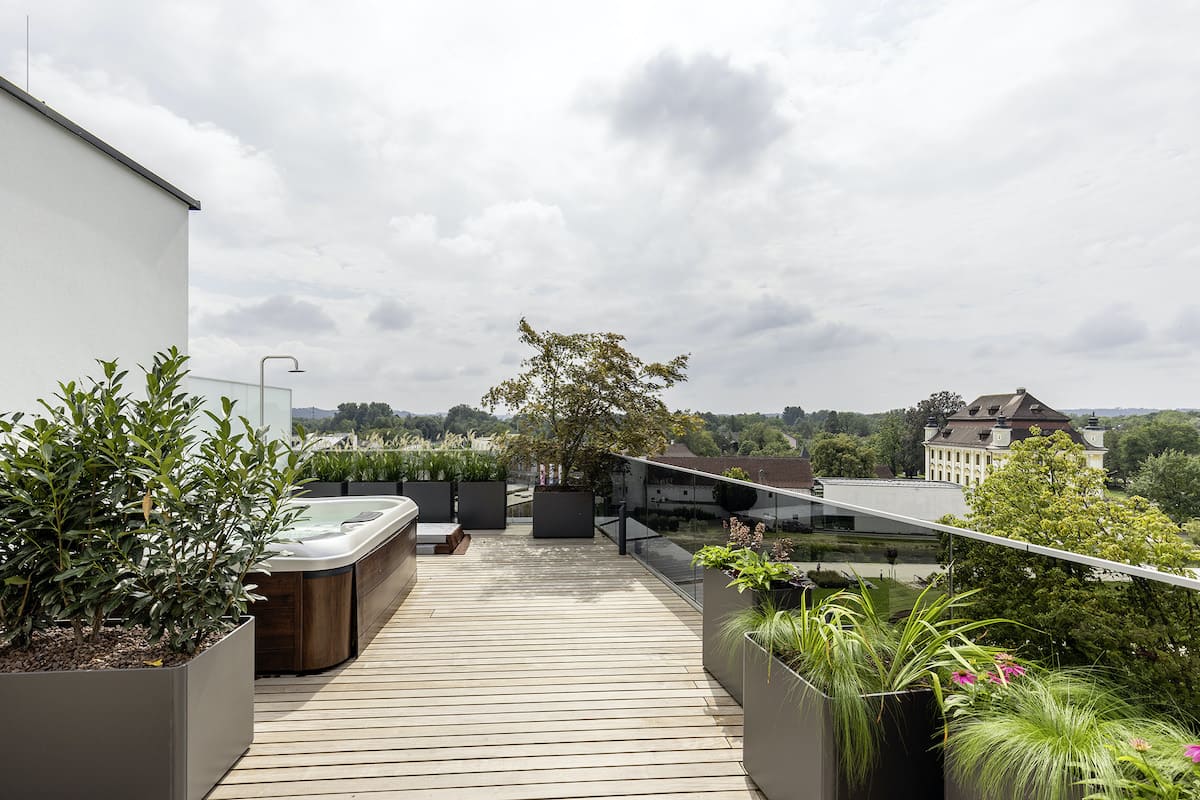 Ist die Wohnung schon hell und lichtdurchflutet, so erlebt man beim Ausblick auf die große Dachterrasse nochmal einen Wow-Effekt. Von der Küche, dem großen Wohnraum wie auch vom Schlafzimmer kann man durch deckenhohe Glasschiebetüren auf die Terrasse hinaustreten. Hier stehen große Pflanzenkübel, ein Jacuzzi und bequeme Sitzgelegenheiten, die zum Verbleiben einladen – ja geradezu drängen. Auch der tolle, weitschweifige Ausblick lässt bei einem das Gefühl eines eigenen Gartens aufkommen.