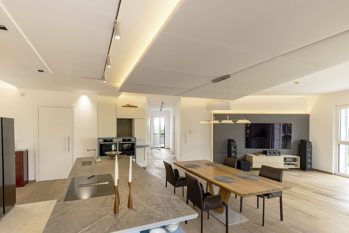„Trotz des offenen Raumkonzepts finde ich das Wohnzimmer sehr gemütlich. Es gibt eine HiFi-Fernsehwand mit modernster Technik und Akustik-Elementen. Alles ist einfach stimmig. Man fühlt sich hier so richtig wohl.“